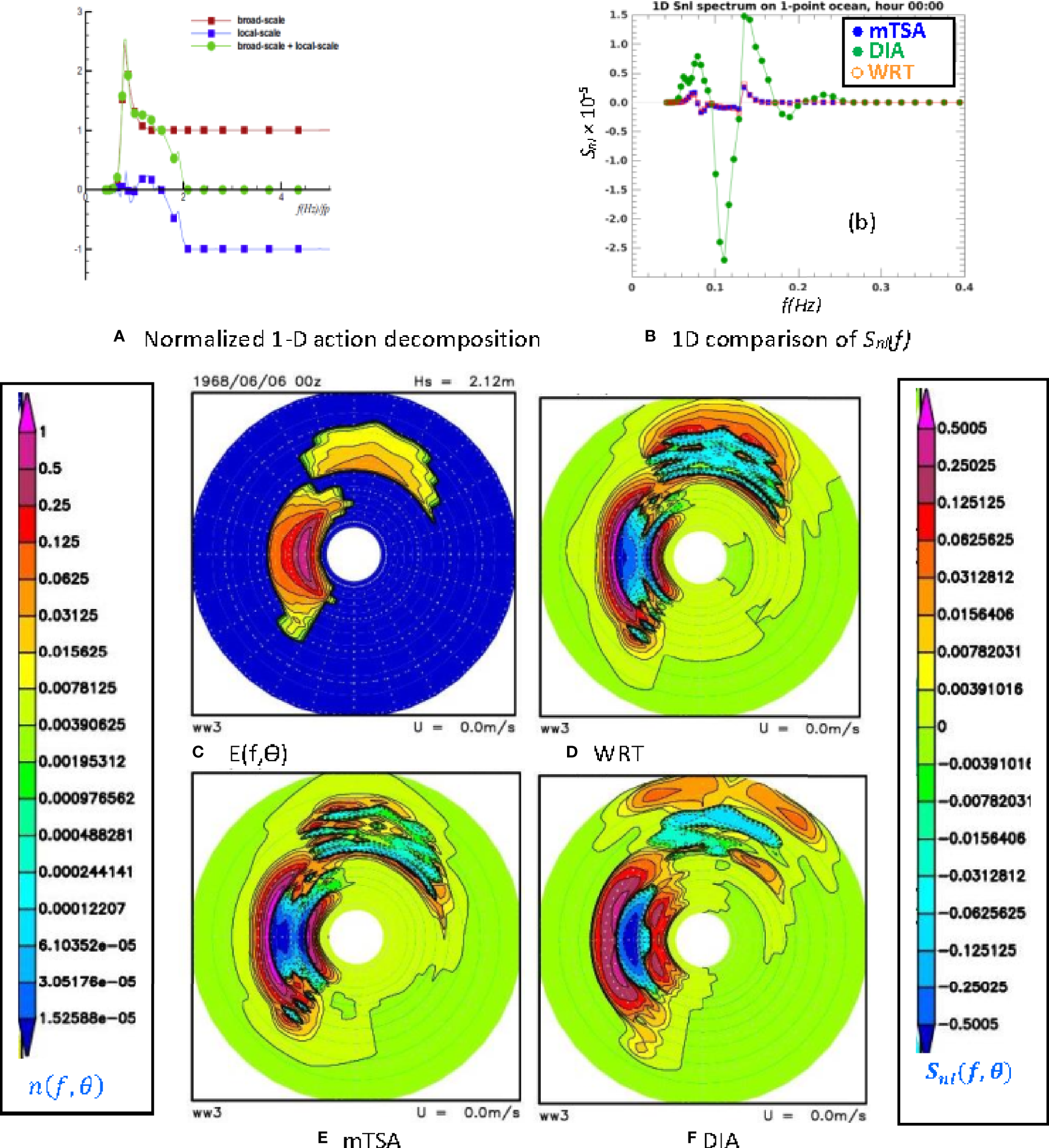 Figure 1 shows comparisons for the 1-D (1-dimensional) and 2-D action density and nonlinear transfer, Snl, for the three formulations, namely DIA, multiple-TSA (denoted mTSA), and WRT. We do not show the single TSA (denoted sTSA) case, because as in the more basic JONSWAP-type cases considered by Perrie et al. (2013), the broad-scale term is able to fit the swell spectral peak region rather well (Figure 1A), and therefore sTSA and mTSA are essentially the same in this case.