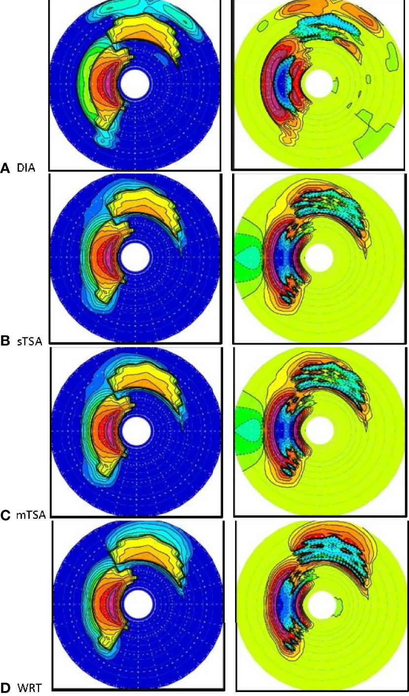 However, this case shows that there is a notable mismatch between and the given test case action, ni, in the high-frequency region, where the energy is almost zero. Thus, the role for the local-scale term is relatively important in this latter region. Resultant 1-D estimates for the nonlinear transfer Snl given by mTSA are able to match those of WRT well, compared to DIA, as shown in Figure 1B, as well for 2-D results shown in Figures 1D–F. By comparison, DIA results have magnitudes that are too large in the positive and negative lobe regions as shown in Figure 1B. While detailed patterns for mTSA and WRT are shown to compare well in Figures 1D, E, DIA results appear distorted in Figure 1F, particularly in the high frequency portion of the spectrum.