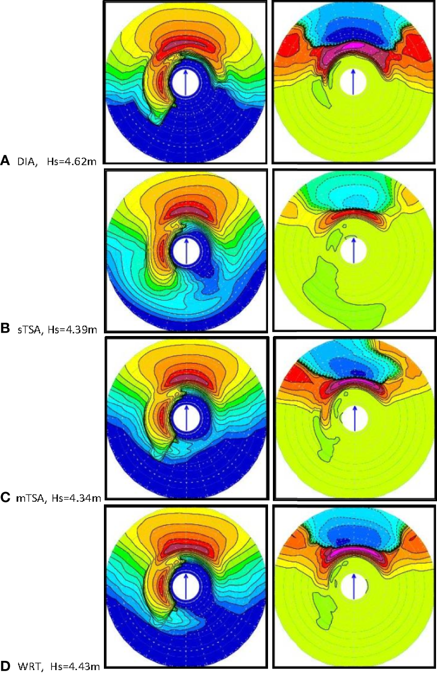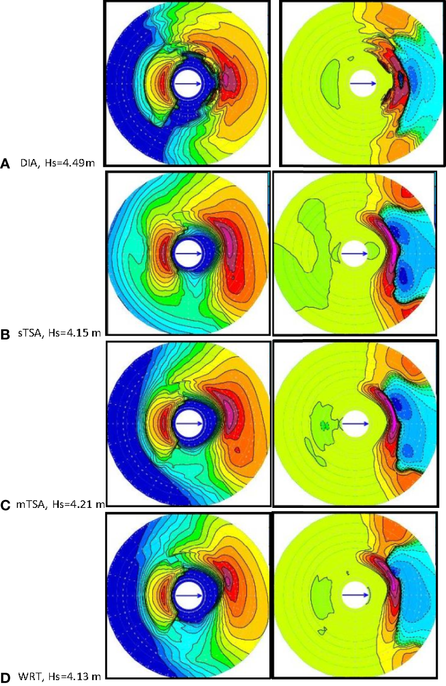 Overall, the qualitative features of the Hs area distributions and wave directions are similar in these four simulations, with respect to the propagation of the wave fields, the overall directional patterns of the waves, and the peak wave directions. Consistent with fetch-limited growth results reported in previous studies by Perrie et al. (2013), mTSA appears to give results that are biased low, whereas results from DIA are biased high compared to those of WRT, using the standard ST4 source terms. These differences in results from respective different Snl formulations may be somewhat modulated by the inherent nonlinearity, numerical instability etc. present in the WW3 model system.