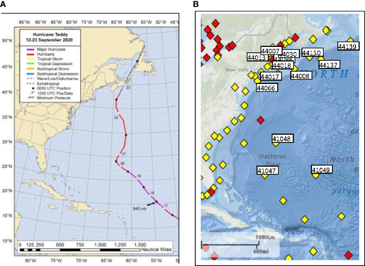 (A) Figure 5 Best track for Hurricane Teddy, 12-23 September 2020. (B) Fourteen NDBC and Canadian buoys used in this study.