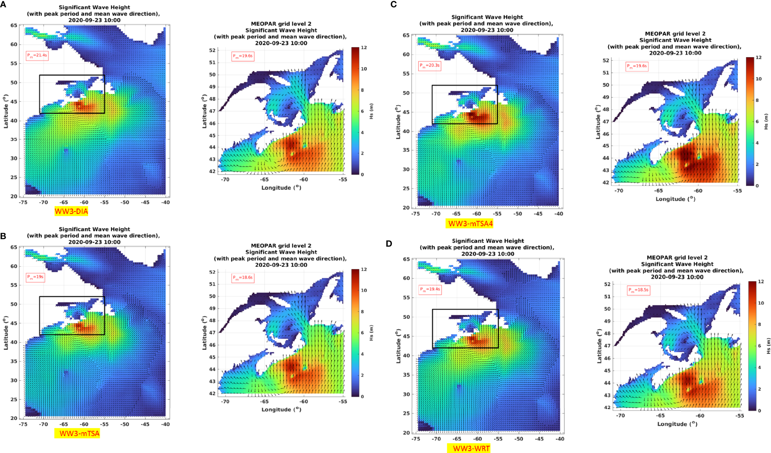 Maps of significant wave height, at the peak of Hurricane Teddy, showing (A) WW3-DIA, (B) WW3-mTSA, (C) WW3-mTSA4, (D) WW3-WRT. Coarse grid (left panel) is at 0.5° resolution and the nested fine-resolution grid (right panel) is 0.1° resolution.