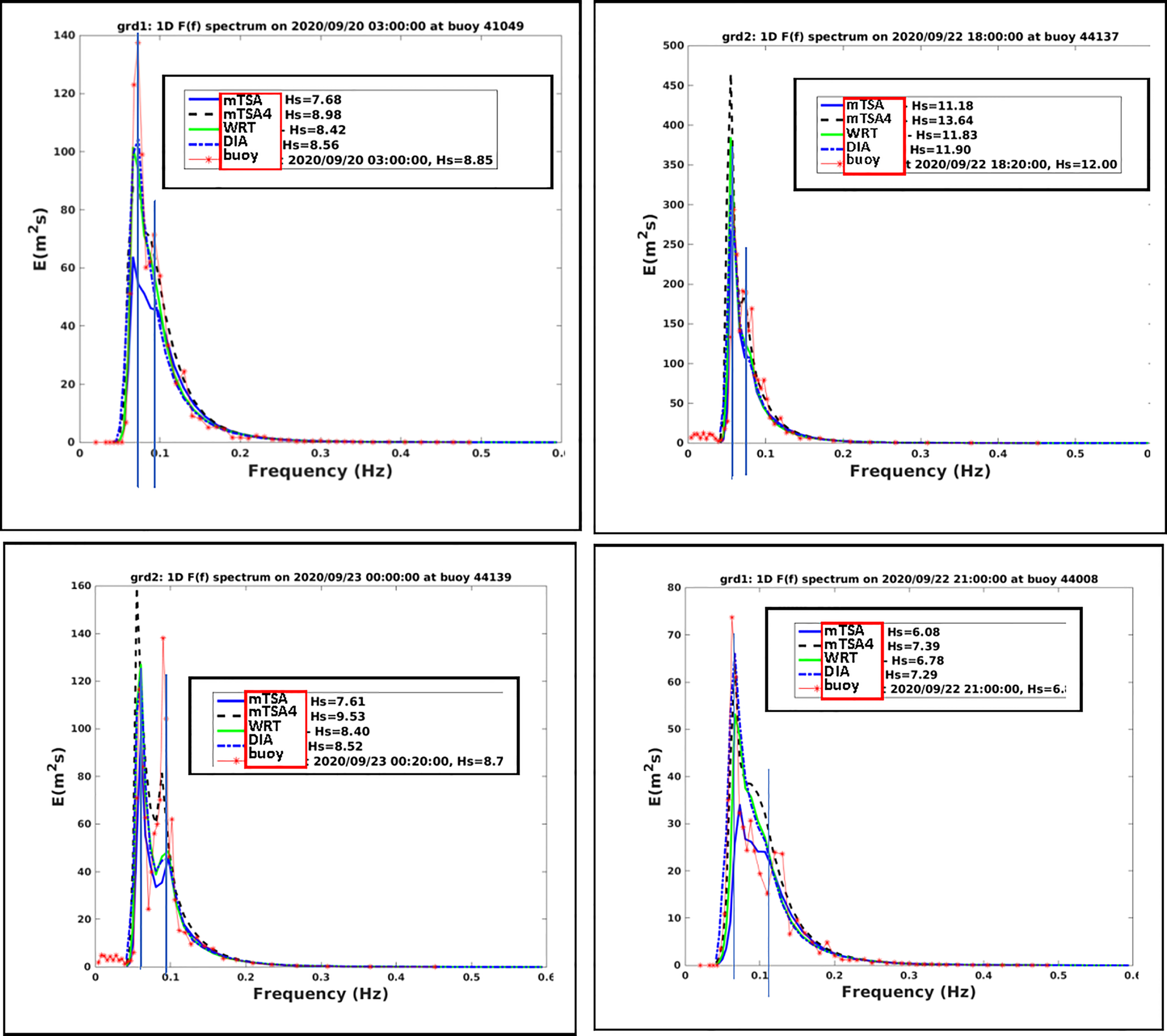 To estimate the reliability of the model simulations using the different nonlinear transfer Snl formulations, we conducted comparisons with measured significant wave heights, Hs, with observations at four buoys in the model domain whose locations are shown in Figure 5B. Comparisons were made between time series of buoy measurements of significant wave heights, Hs, and the model simulations for Hurricane Teddy, using the implemented Snl formulations; DIA, mTSA, mTSA4 and WRT. Buoy observations are generally reported at 30-minute intervals.