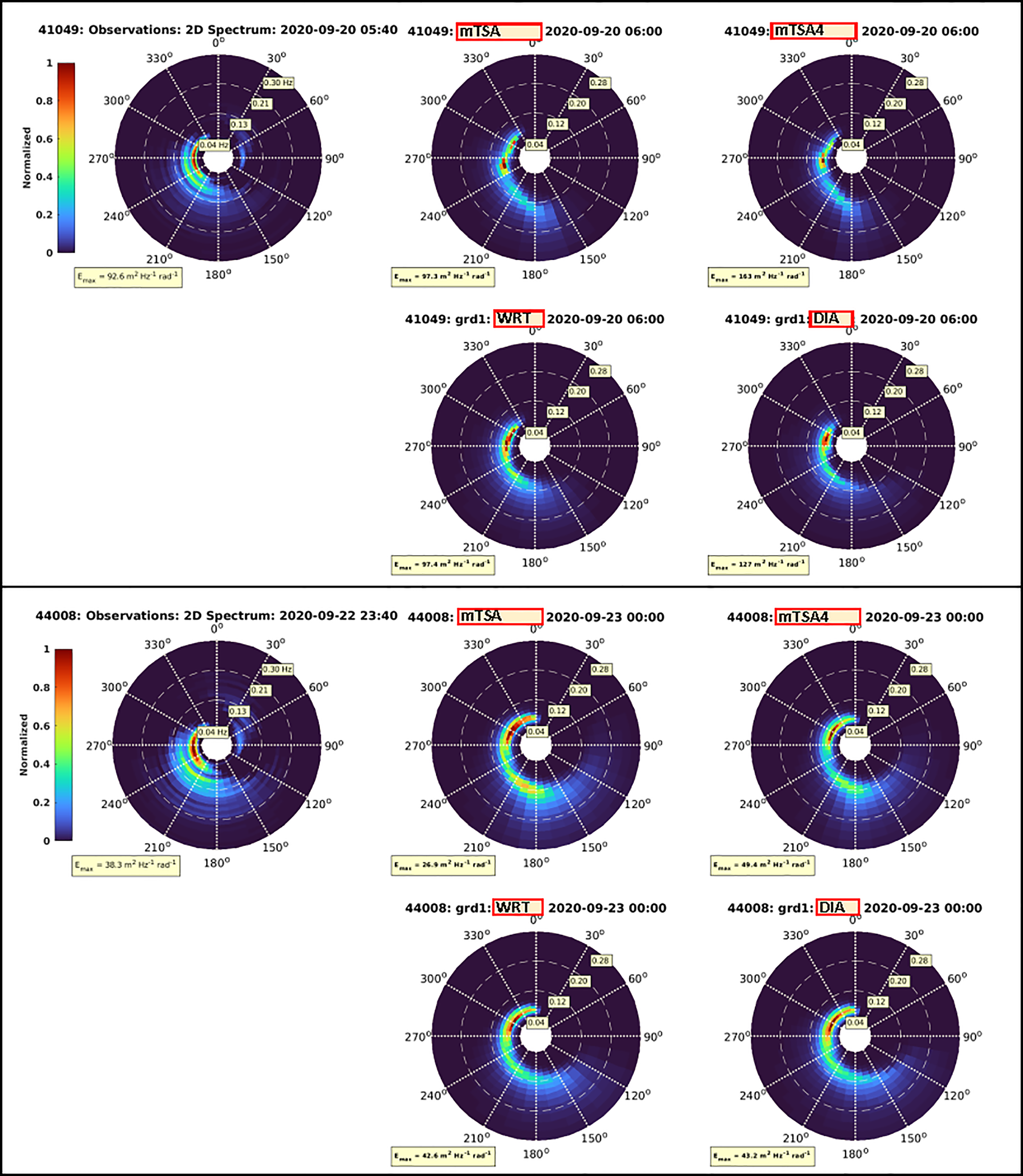 Figure 7 shows Hs time series and scatter plots at four selected buoys along Teddy’s storm track. These are buoy 41049 near Bermuda, 44008 off Cape Cod, 44137 off Nova Scotia and 44139 near the southern tip of the Grand Banks. These four were selected in order to have additional discussion regarding 1-D and 2-D spectra, in the sections that follow. A summary of statistics for specifically these 4 buoys, plus an additional 10 other buoys along, or near, the storm track of Teddy, indicated in Figures 5A, B is presented in Table 1, in terms of root mean square error (RMSE), bias, correlation coefficient (corr), and scatter index (SI). In this computation of statistics, only data within ± 3 days of the passage of the storm by a given buoy are used; these data are indicated in Figure 7. Note that the full observational time series are indicated by red stars (*), with the points used to calculated statistics (within ± three days of the peak) marked by black circles ʘ overlaying the red stars (*).