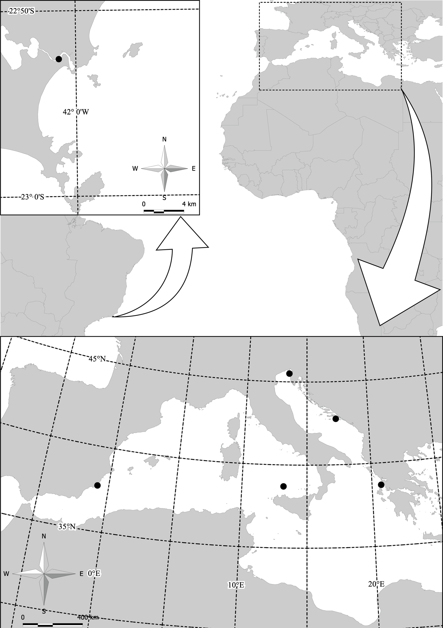 Sampling sites of Cotylorhiza tuberculata and Phylorhiza punctata in the Mediterranean Sea and the sampling site of Cassiopea xamachana from the coast of Cabo Frio (Rio de Janeiro, Brazil).