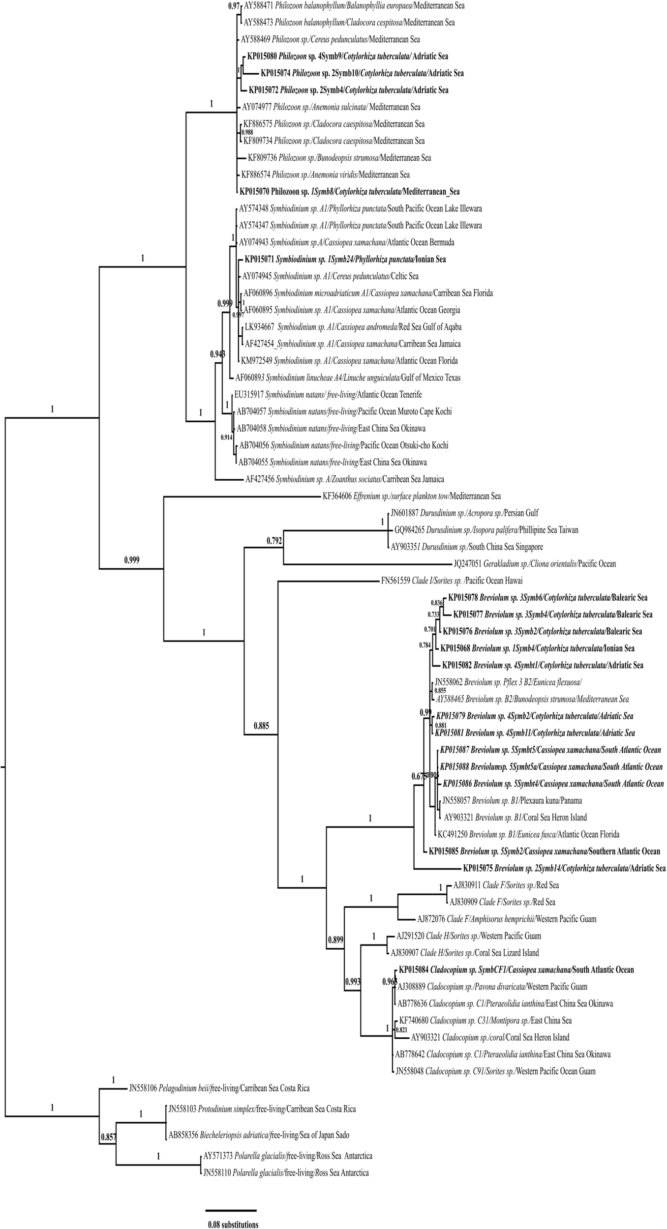 Several sequences belong to the genus Philozoon and originate from samples of Cotylorhiza tuberculata collected in the Adriatic Sea: Gulf of Trieste (KP015080), Lake Mljet (KP015074, KP015072), and the Ionian Sea (KP015070), but not from the Balearic Sea. Medusae of Cotylorhiza tuberculata from the Balearic Sea (KP015078, KP015077, and KP015076), Ionian Sea (KP015068), and Adriatic Sea (KP015082, KP015079, and KP015081) harboured symbionts of Breviolum, especially those of type B2. In addition, the symbionts of Cassiopea xamachana collected in Cabo Frio (Rio de Janeiro, Brazil) pertain to this group (KP015087, KP015088, and KP015086). All of the groups mentioned have high bootstrap support of the nodes. Other sequences within the groups are derived from symbionts from a variety of hosts, including corals, anemones, scyphozoans, and free-living species (see Table S2 for more details).