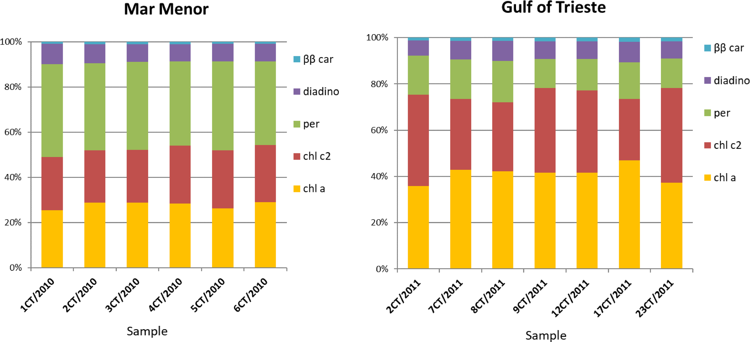 Contribution of five different pigments (chlorophyll a, chl a; chlorophyll c2, chl c2; peridinin, per; diadinoxanthin, diadino; β,β-carotene, ββ car) in the symbionts identified as Breviolum sp. (Mar Menor, Balearic Sea; October 2010) and Philozoon medusarum (Gulf of Trieste, Adriatic Sea, August 2011) isolated from Cotylorhiza tuberculata.