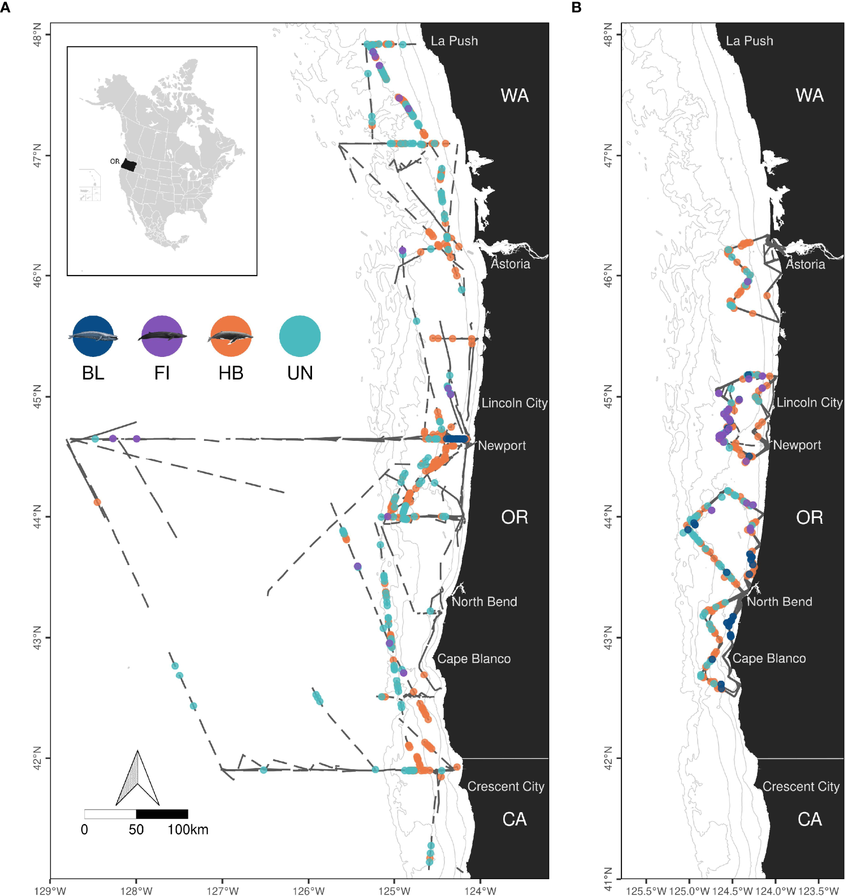 Map of shipboard (A) and helicopter (B) survey effort and observations of rorquals (BL, blue whales; FI, fin whales; HB, humpback whales; UN, Unidentified rorquals) from 2016 to 2021 in Oregon waters (OR), USA. Dark grey lines represent surveyed transect lines in Oregon (OR), California (CA) and Washington (WA) states. Land is shown in black. Isobaths (50, 100, 500, 1,000 and 1,500 m deep) are represented with grey lines. Maps are limited to 41°N but shipboard effort extends south to 37°N. Credits for whale illustrations: Frédérique Lucas and NOAA Fisheries.
