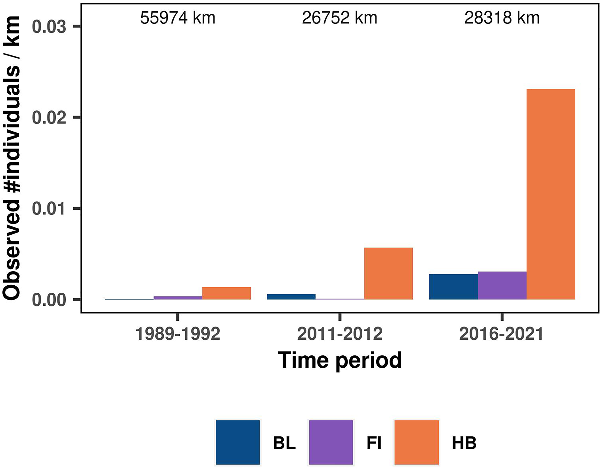 Comparison of the number of individual whales observed per km of effort across systematic research surveys conducted in 1989-1992 (DELPHIN and ORWA marine mammal and seabird surveys), 2011-2012 (PaCSEA surveys) and 2016-2021 (present study). The numbers on top of each bar indicate kilometers surveyed in each period. See Supplementary Tables S2–S3 for more details about systematic research survey data included in the comparison and Supplementary Figure S8 for alternative approach to the sighting rate comparison.