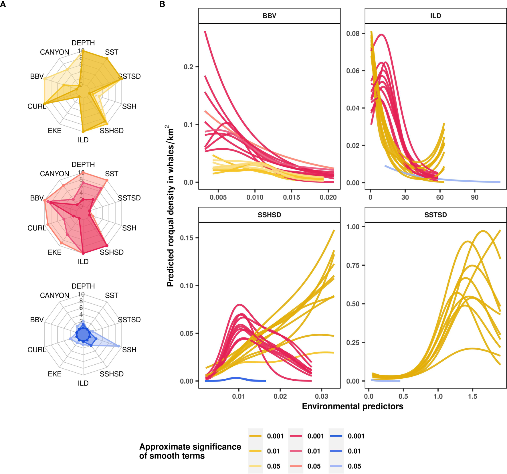 Rorqual ecological relationships modelled over three seasons: April-July (Mror-spring, in yellow), August-November (Mror-summer, in pink) and December-March (Mror-winter, in blue). Variable contributions to rorqual models illustrated as radar plots (A) are measured by the number of cross-validation folds in which the approximate smooth significance p-values were below 0.05, 0.01 or 0.001 (shown with increasingly dark color shades). Functional response curves (B) represent the effect of the smooth function of a selected set of predictor variables (BBV, ILD, SSHSD and SSTSD) upon the trend in rorqual density, with higher values indicating higher predicted densities. Solid lines represent the marginal effect of each variable relative to rorqual density per season and per cross-validation fold. Only the contributors with approximate smooth significance p-value < 0.05 are shown per model fold. Environmental variables: distance to canyons (CANYON in km), seabed depth (DEPTH in m), sea surface temperature (SST in °C) and its spatial standard deviation (SSTSD calculated over 0.3° squares), sea surface height (SSH in m) and its standard deviation (SSHSD calculated over 0.3° squares), eddy kinetic energy (EKE calculated from eastward and northward surface current velocities, kg·m2·s−2), wind stress curl (CURL in Newton.m-3), isothermal layer depth (ILD in m) and bulk buoyancy frequency (BBV in s-1).