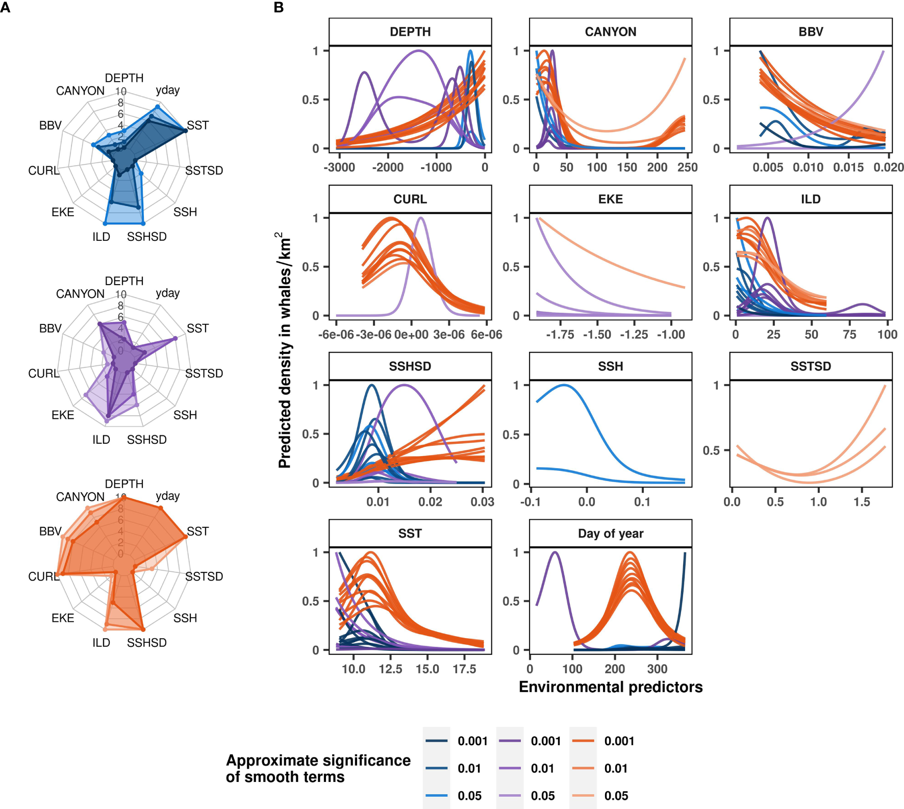 Blue, fin and humpback whale ecological relationships modelled with Mbl (in blue), Mfi (in purple) and Mhb (in orange) respectively. Variable contributions to species-specific models illustrated as radar plots (A) are measured by the number of cross-validation folds in which the approximate smooth significance p-values were below 0.05, 0.01 or 0.001 (shown with increasingly dark color shades). Functional response curves (B) represent the effect of the smooth function of environmental variables upon the trend in rorqual density, with higher values indicating higher predicted densities. Solid lines represent the marginal effect of each variable relative to whale density per cross-validation fold. Only the contributors with approximate smooth significance p-value < 0.05 are shown per model fold. Environmental variables: day of year (yday), distance to canyons (CANYON in km), seabed depth (DEPTH in m), sea surface temperature (SST in °C) and its spatial standard deviation (SSTSD calculated over 0.3° squares), sea surface height (SSH in m) and its standard deviation (SSHSD calculated over 0.3° squares), eddy kinetic energy (EKE calculated from eastward and northward surface current velocities, kg·m2·s−2), wind stress curl (CURL in Newton.m-3), isothermal layer depth (ILD in m) and bulk buoyancy frequency (BBV in s-1).