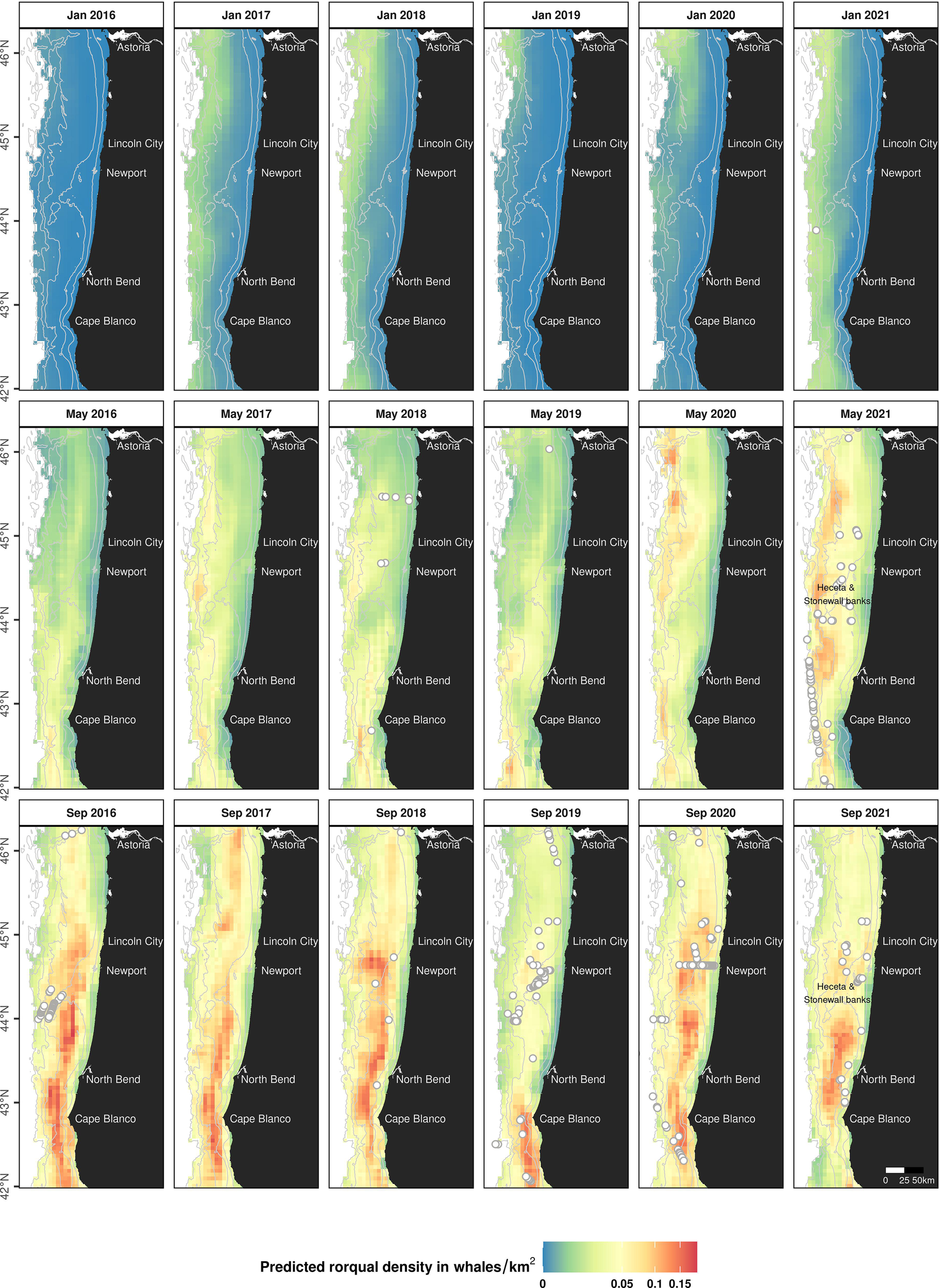 Predictive maps of rorqual densities (Figure 6) were produced for the months of interest (January, May and September) corresponding to each seasonal model (Mror-winter, Mror-spring and Mror-summer respectively). The seasonal migratory behavior of rorquals was clearly reflected in these predictions, whereby densities across the majority of the study area were generally predicted to be low in January, increase through May, and be the highest in September. In comparison to other months, predicted densities in January were very low across the Oregon shelf and slope. Densities increased in May, specifically over a few discrete hotspots located on the continental slope and varying across years. In September, densities peaked and were predicted to be the highest on the continental shelf, off Cape Blanco, North Bend and Newport. Over all seasons, densities were predicted to be low in nearshore, shallow waters (< 50 m deep), with the exception of the nearshore waters south of Cape Blanco where rorquals are predicted to occur in relatively high numbers in September.