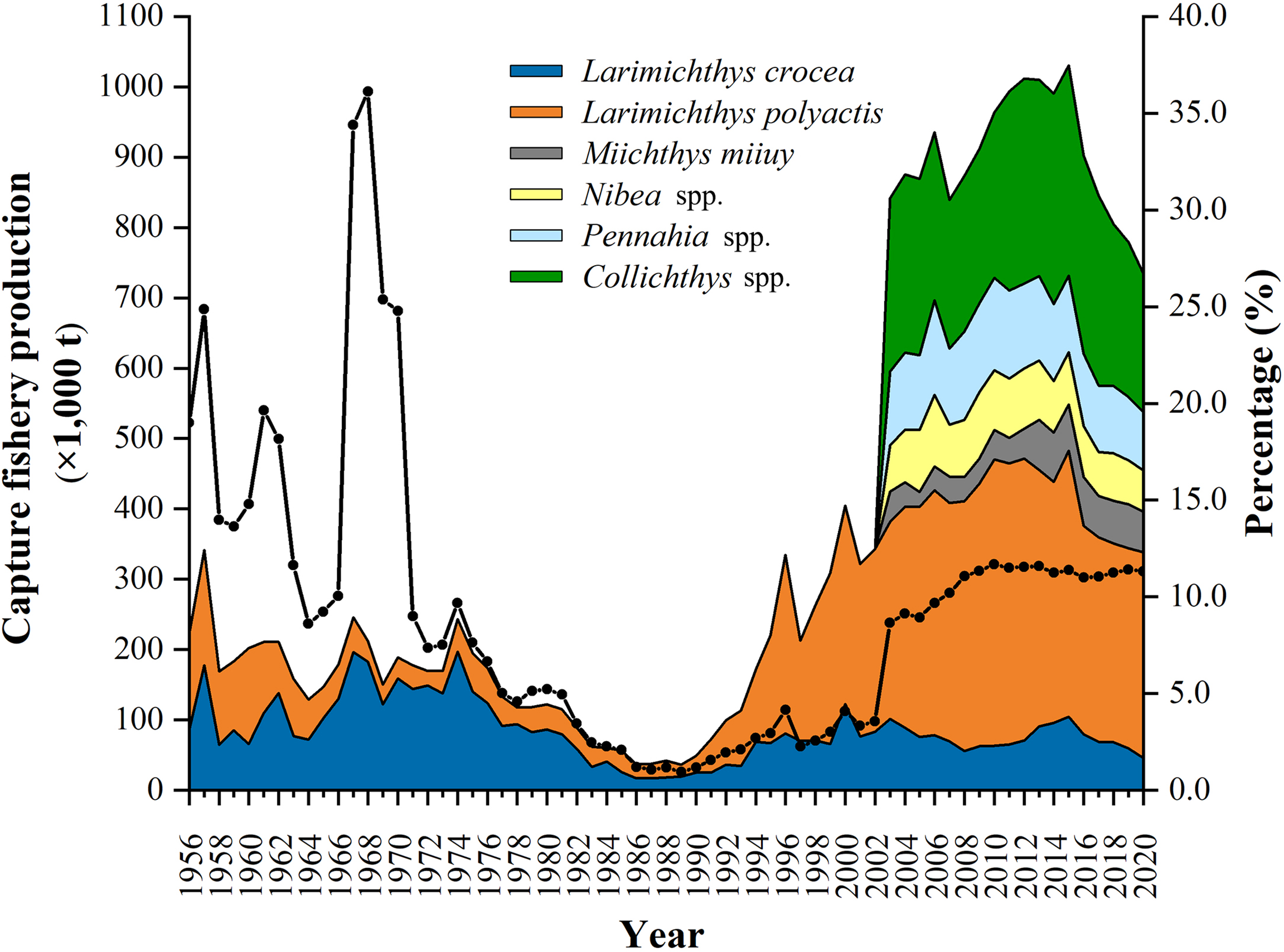 The estimated statistical annual sciaenid (three at species level and three at genus level) capture fishery productions (× 1,000 t) between 1956 and 2020 in China, together with their contributions (percentage, %) (solid line) to the annual total marine fish capture productions (MOA, 1950–2018; MARA, 2019–2021).