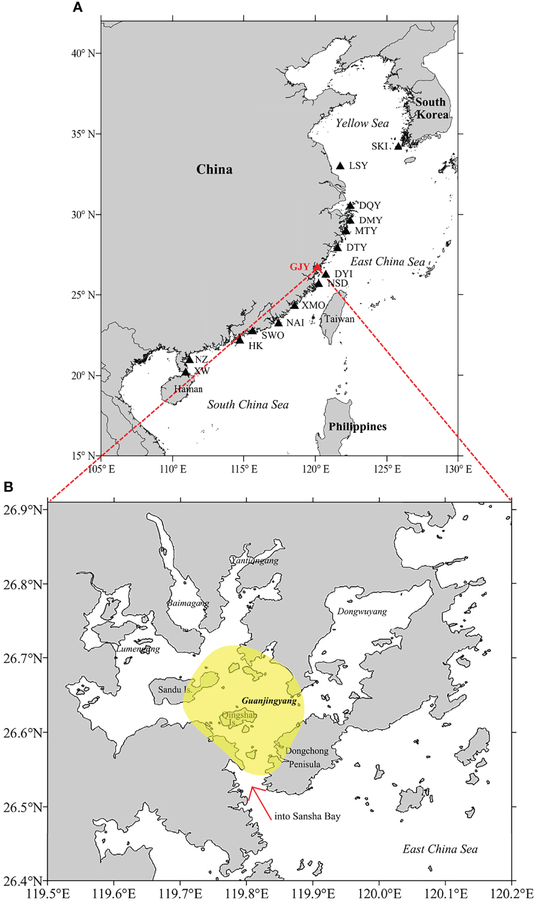 (A) Locations of the 15 spawning grounds for Larimichthys crocea in its distribution region (SKI, South Korea-inshore; LSY, Lusiyang; DQY, Daiquyang; DMY, Damuyang; MTY, Maotouyang; DTY, Dongtouyang; GJY, Guanjingyang; DYI, Dongying Island; NSD, Niushan Island; XMO, Xiamen offshore; NAI, Nanao-inshore; SWO, Shanwei offshore; HK, Hong Kong; NZ, Naozhou; XW, Xuwen). (B) Map of Sansha Bay indicating the sampling area (yellow), Guanjingyang (GJY) waters, Fujian Province, China (red arrow shows the only entrance of Sansha Bay).