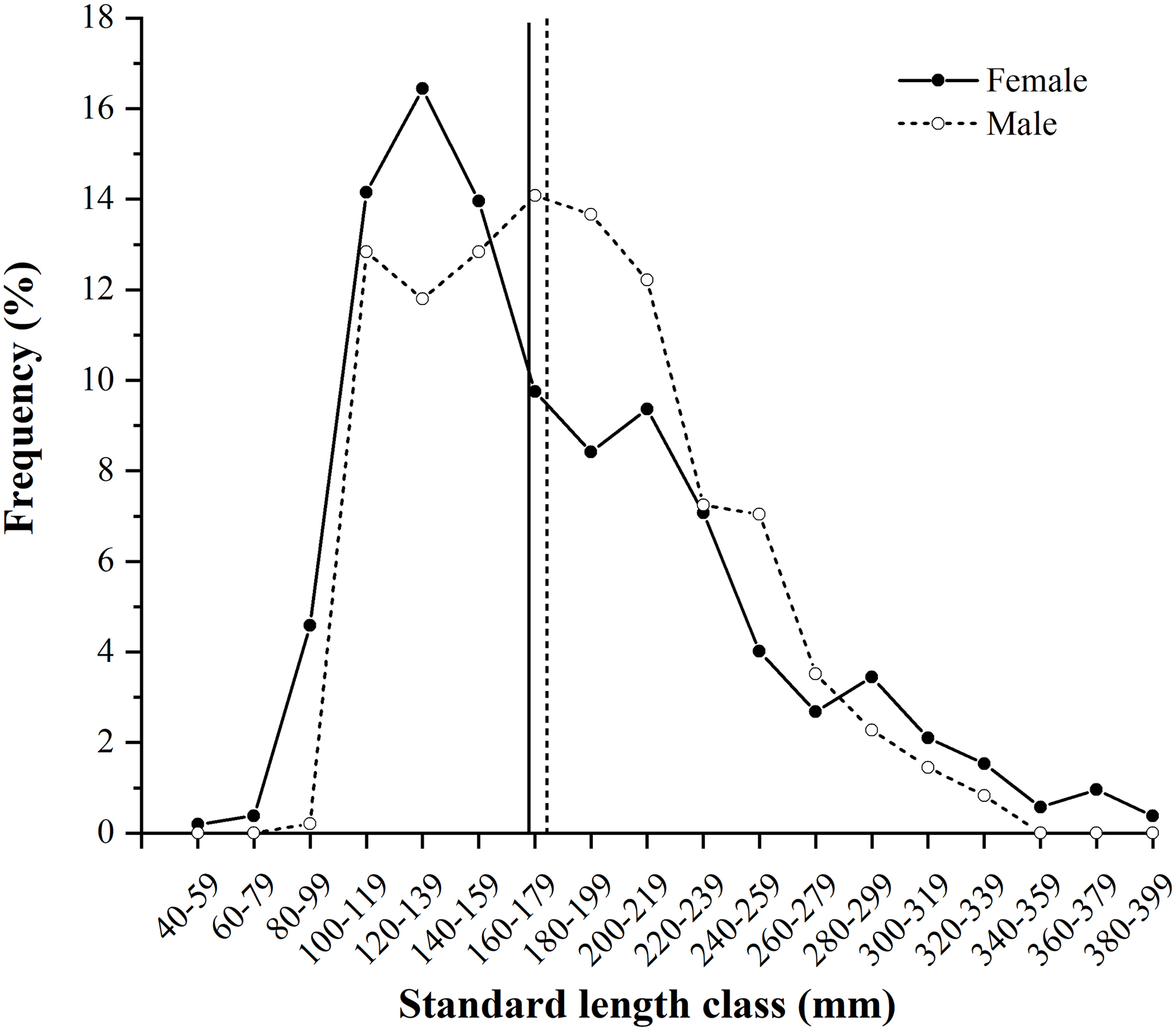 Size (standard length, mm) frequency (%) of Larimichthys crocea females (N = 523) and males (N = 483) collected from April 2019 to November 2021. Vertical solid and dashed lines indicate the average sizes of females and males, respectively.