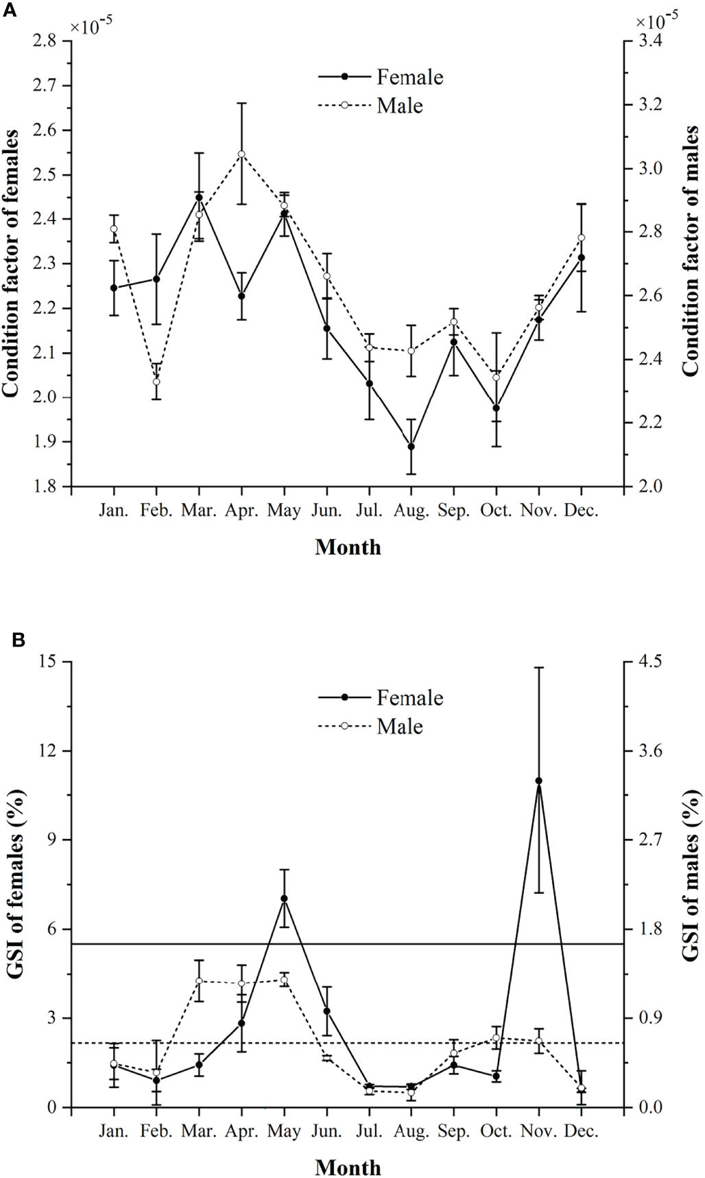 Females and males showed monthly variations in GSI%, with females generally having higher GSI% than males (Mann-Whitney U-test, U = 75182, p < 0.01) (Figure 4B). Two spawning peaks were found in spring and autumn, i.e., in May and November for females, and in March to May and October to November for males. The significant difference of GSI% between the two spawning peaks was only found in males, with spring higher than autumn (Mann-Whitney U-test, U = 6435, p < 0.05).