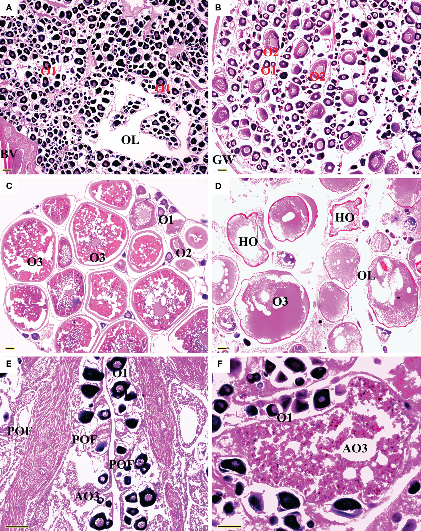 Sexual maturity stages in females of Larimichthys crocea. (A) F1: Immature/resting (175 mm SL, July 2021); (B) F2: Developing (212 mm SL, April 2021); (C) F3: Maturing (249 mm SL, June 2020); (D) F4: Ripe (198 mm SL, May 2019); (E) F5: Spent (212 mm SL, June 2021); (F) F5: Spent (360 mm SL, June 2021). AO3, atretic vitellogenic stage oocyte; BV, blood vessels; GW, gonadal wall; HO, hydrated oocyte; O1, primary growth stage oocyte; O2, cortical-alveolar stage oocyte; O3, vitellogenic stage oocyte; OL, ovarian lumen; POF, post-ovulatory follicles. Scale bars: 100 μm.