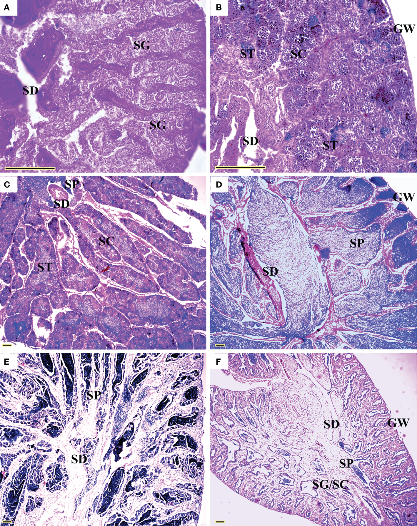 Sexual maturity stages in males of Larimichthys crocea. (A) M1: Immature/resting (144 mm SL, February 2021); (B) M2: Developing (167 mm SL, June 2020); (C) M3: Maturing (175 mm SL, May 2020); (D) M4: Ripe (248 mm SL, February 2021); (E) M4: Ripe (177 mm SL, March 2021); (F) M5: Spent (212 mm SL, July 2021). GW, gonadal wall; SC, spermatocytes; SD, sperm duct; SG, spermatogonia; SP, sperm; ST, spermatids. Scale bars: 100 μm.