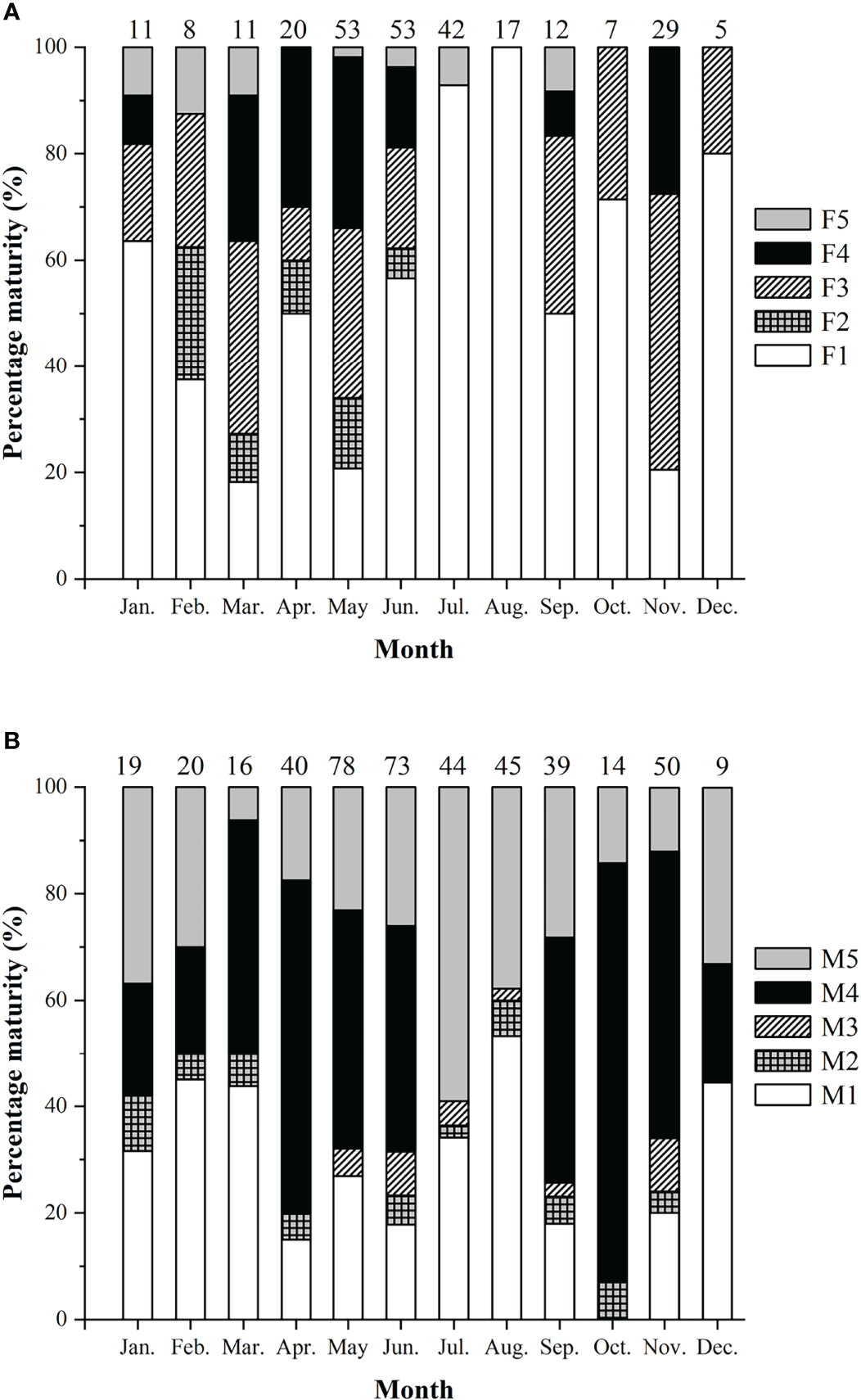 Percentage of sexual maturity stages of Larimichthys crocea.(A) Female. (B) Male. F1/M1: immature/resting; F2/M2: developing; F3/M3: maturing; F4/M4: ripe; F5/M5: spent. Numbers above the bars referred to the sample sizes.