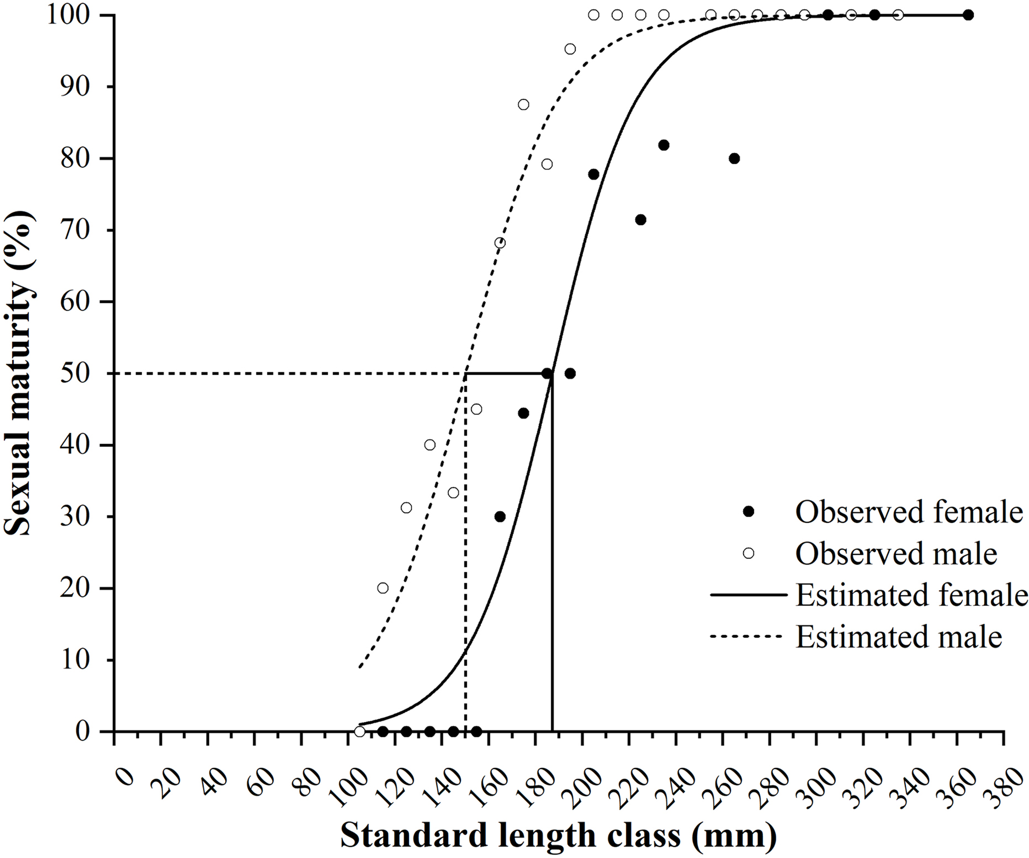 SL at which 50% of individuals attained sexual maturity (SL50) for females and males were determined by plotting the percentage of mature individuals (female: F3, F4, and F5; male: M3, M4, and M5) at 10-mm-SL-size class interval. Only the individuals during the spawning peak determined by gonad histology were used for analysis. A maturity curve was estimated by fitting a logistic equation as follows (Sparre and Venema, 1999; Crabtree et al., 1997):