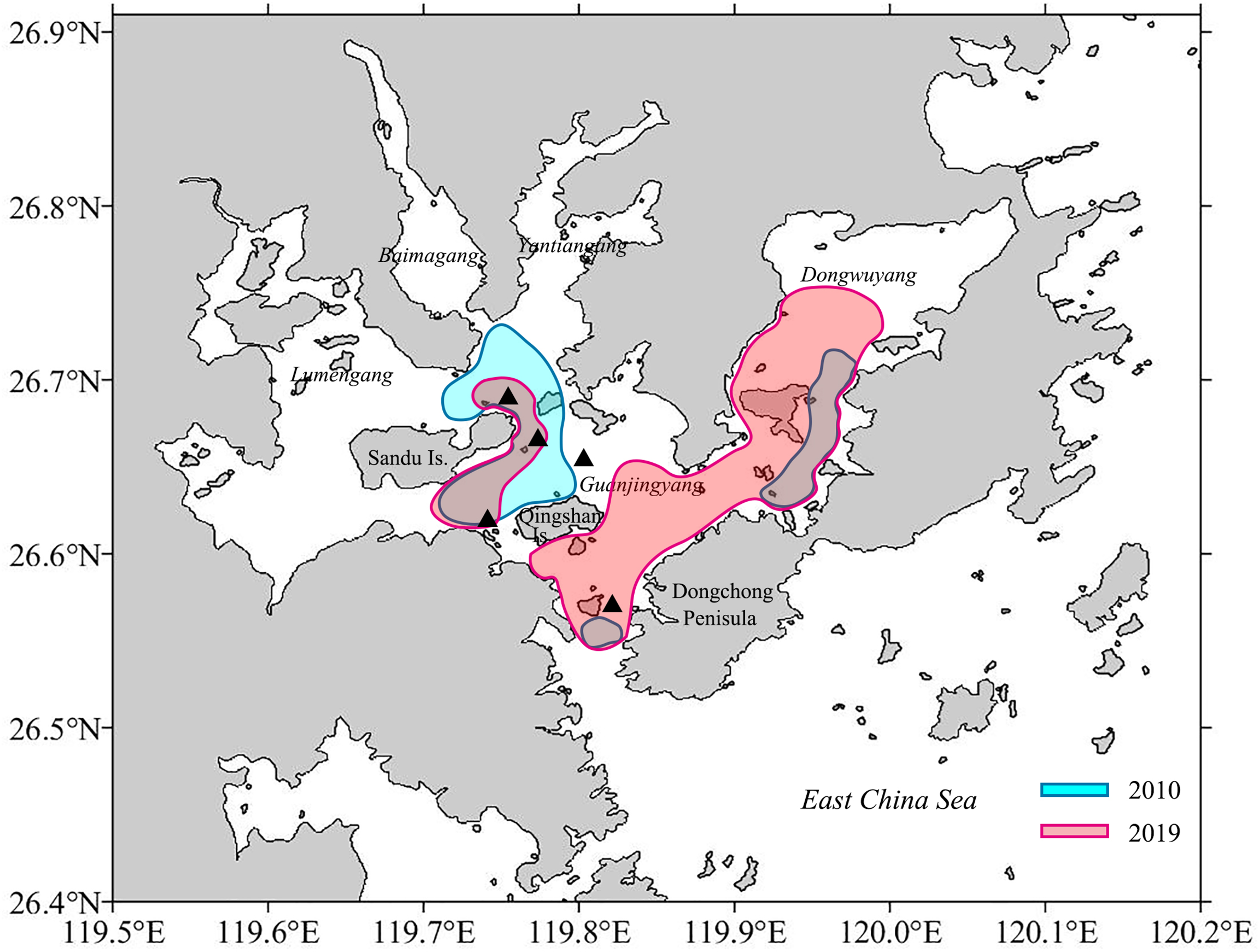 Sansha Bay (26.40−27.00° N, 119.50−120.20° E), a typical semi-enclosed bay, is located in northern Fujian Province of China. Within Sansha Bay, there is a well-known L. crocea spawning ground, i.e., Guanjingyang (GJY) spawning ground, the only semi-enclosed bay type spawning ground among the 15 spawning grounds identified in its distribution region (Liu and Sadovy de Mitcheson, 2008; Zhang et al., 2011) (Figure 2). On the basis of the catch data, two spawning seasons were reported for L. crocea in GJY, i.e., in May to June and in September to October, referring to the spring and autumn spawning seasons, respectively; furthermore, the spring spawning season was considered as the main one (Chu and Wu, 1985; Zhang and Hong, 2015). The reductions of the minimum size [standard length (SL)] and body weight (BW) at female sexual maturity and the increase of growth rate in L. crocea were observed in GJY from the late 1950s to the late 1980s over three decades (Xu et al., 1980; Lin et al., 1992; Liu and Sadovy de Mitcheson, 2008). Although there were biological data available aforementioned, detailed studies through year-round sampling to determine the natural spawning season and the peak and the size at 50% maturity using the cost-effective gonad histology method have not been conducted for L. crocea in GJY, neither throughout the distribution region.