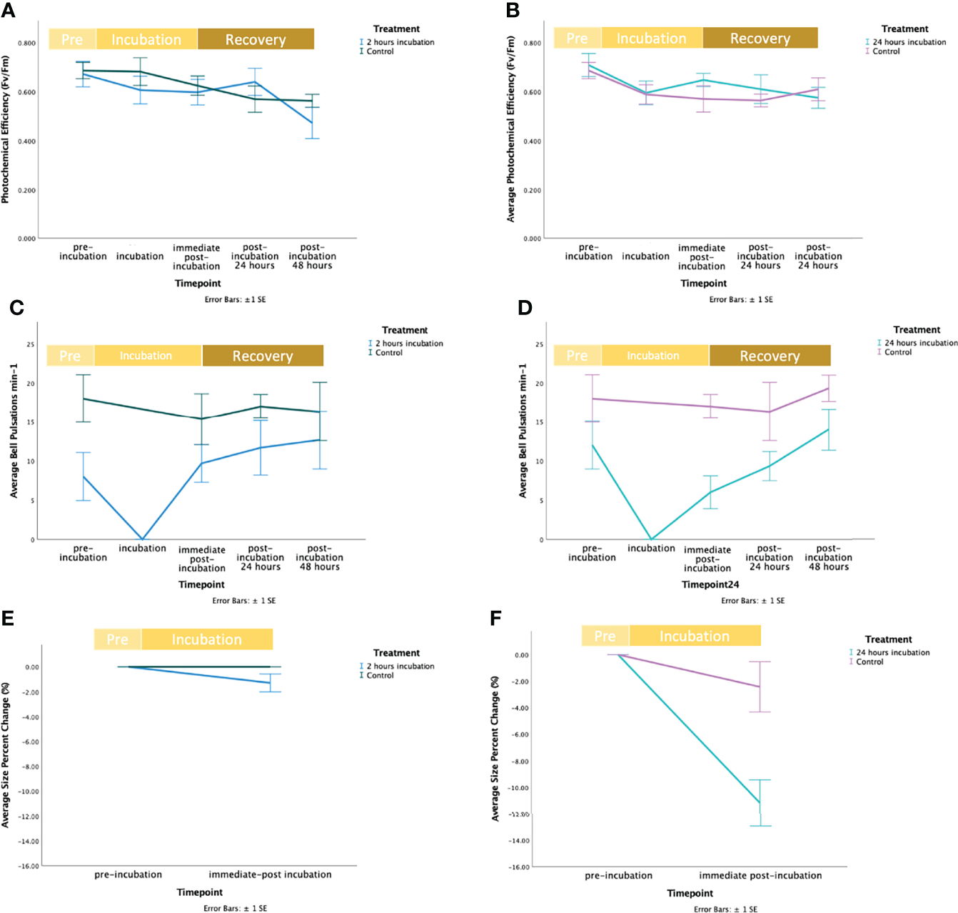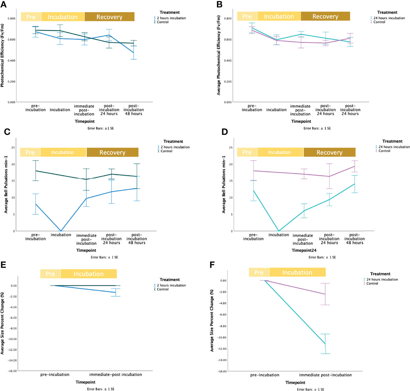 Figure 1 Fluctuation of response variables during the exposure of Cassiopea sp. jellyfish to Magnesium Chloride (MgCl2), including the recovery time. In figures a, c, and e the blue line represents the control, and the green line represents the treatment. In figures b, d, and f the purple line represents the control, and the mint line represents the treatment. (A) Fluctuations of average photochemical efficiency (Fv/Fm) at the start (“pre-incubation”), middle (“incubation”) and end (“immediate post-incubation”) of the 2 hours exposure to MgCl2 and during the recovery period (i.e., “post-incubation 24 hours” and “post-incubation 48 hours” indicates the recovery period of 24 and 48 hours after the end of the exposure to MgCl2). Bars represent standard error (± SE). (B) Fluctuations of average photochemical efficiency (Fv/Fm) at the start (“pre-incubation”), middle (“incubation”) and end (“immediate post-incubation”) of the 24-hour exposure to MgCl2 and during recovery period (i.e., “post-incubation 24 hours” and “post-incubation 48 hours” after the end of the exposure to MgCl2). Bars represent standard error (± SE). (C) Fluctuations of the average number of bell pulsations min-1 at the start (“pre-incubation”), middle (“incubation”) and end (“immediate post-incubation”) of the 2-hour exposure to MgCl2 and during the recovery period (i.e., “post-incubation 24 hours” and “post-incubation 48 hours” indicates the recovery period of 24 and 48 hours after the end of the exposure to MgCl2). Bars represent standard error (± 1SE). (D) Fluctuations of the average number of bell pulsations min-1 at the start (“pre-incubation”) and end (“immediate post-incubation”) of the 24-hour exposure to MgCl2 and during the recovery period (i.e., “post-incubation 24 hours” and “post-incubation 48 hours” indicates the recovery period of 24 and 48 hours after the end of the exposure to MgCl2). Bars represent standard error (± SE). (E) Fluctuations of the average size percent change (%) at the start (“pre-incubation”), and end (“immediate post-incubation”) of the 2-hour exposure to MgCl2. Bars represent standard error (± 1SE). (F) Fluctuations of the average size percent change (%) at the start (“pre-incubation”), and end (“immediate post-incubation”) of the 24-hour exposure to MgCl2. Bars represent standard error (± 1SE).