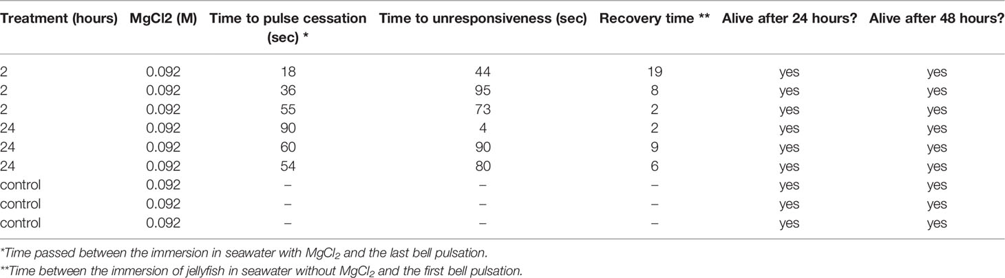 Table 1 Summary of the main responses of Cassiopea sp.jellyfish to the MgCl2 treatment (e.g., time to pulse cessation, time to unresponsiveness, recovery time, and survival).