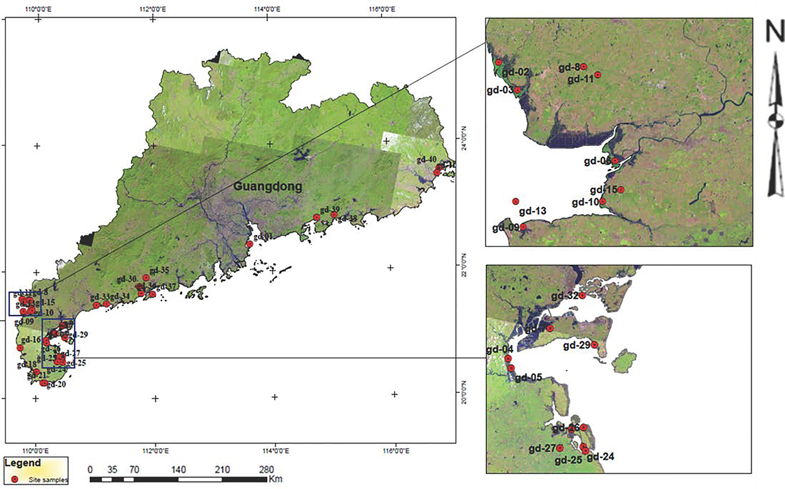 The samplings were collected for 34 different locations throughout the Guangdong mangrove forest, at latitude 20°12’–25°31’ N and longitude 109°45’–117°20’ E (Figure 1). The sampling sites are characterized by different species of true mangroves, such as Acrostichum aureum, Excoecaria agallocha, Bruguiera gymnorrhiza, Kandelia obovata, Rizhophora stylosa, Lumnizera racemosa, Aegicera corniculatum, Avicennia marina, and Acanthus ilicifolius, and non-true mangrove species, e.g., Pongamia pinnata, Hibiscus tiliaceus, Thespesia populnes, Herltiera littoralis, Cerbera manghas, Clerodendrum inerme, and Pluchea indica (Inyang and Wang, 2020). Guangdong’s mangrove forest is influenced by semidiurnal to mixed tides all year, with a tidal range of 0.8 m during neap tides and 4.0 m during spring tides. The average annual precipitation in the study region is ~2,000 mm (Liu, 2013), and approximately 85% of the total rainfall is concentrated in the rainy season from April to September.