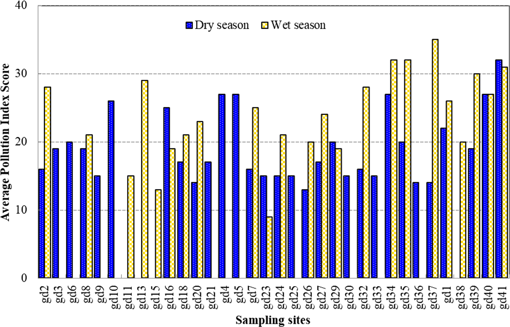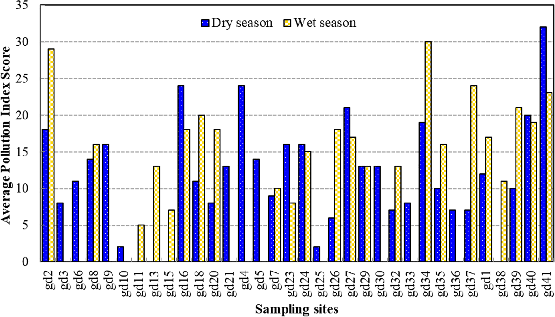 The univariate statistics of the environmental characteristics of the 11 water quality parameters including pollution indices across the mangrove forest in two different seasons (dry and wet) are given in Table 2. The pH was within the range for surface water standard limit and showed no significant difference between the two seasons (p < 0.05) while turbidity fluctuated above the limit across most of the sampling sites during both seasons and showed no significant difference between the two seasons. Electrical conductivity, total dissolved solids, nitrate, and phosphate were significantly different between the two seasons (p < 0.05 or p < 0.01). However, EC, TDS, and phosphate values in most of the sampling sites were above the standard limit, whereas nitrate was below the limit value in most of the sites during the wet season but above its limit value in the Pearl River axis of the Guangdong coast during the dry season.