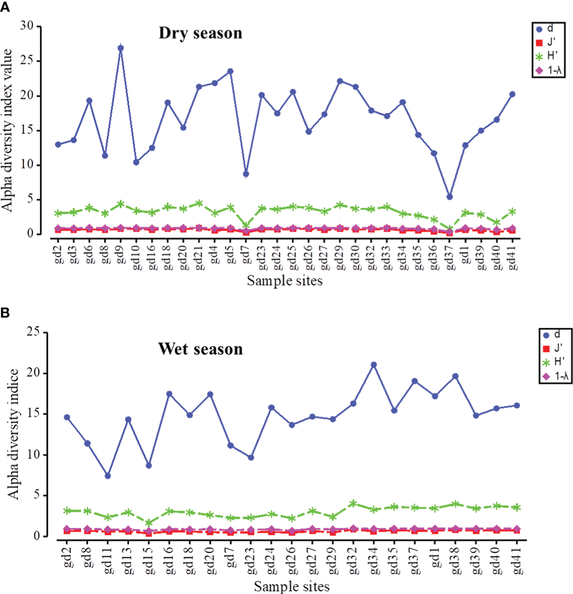 Therefore, microalgae alpha-diversity indices, algal biomass, algal pollution indices, single-factor trophic state index (TSI Chl a), and Canadian Council of Ministers of the Environment Water Quality Index (WQI: CCME) were evaluated in the mangrove forest along the Guangdong coast, South China. Correlation analysis (Pearson correlation) and multivariate analysis were applied to understand the response of microalgae alpha-diversity indices and algal pollution indices to nutrients and other environmental parameters. Microalgae alpha-diversity indices and WQI: CCME were compared during the wet and dry seasons across the mangrove forest. The purposes of the study are as follows: (i) to explore the impact of hydrological parameters on microalgae indicator species; (ii) to understand alpha-diversity indices and algal pollution indices in relation to nutrient distribution; (iii) to establish trophic conditions of the mangrove forest through evaluation of algal pollution indices, algal diversity indices, and TSI (Chl a); and (iv) to evaluate the WQI: CCME across the mangrove forest.