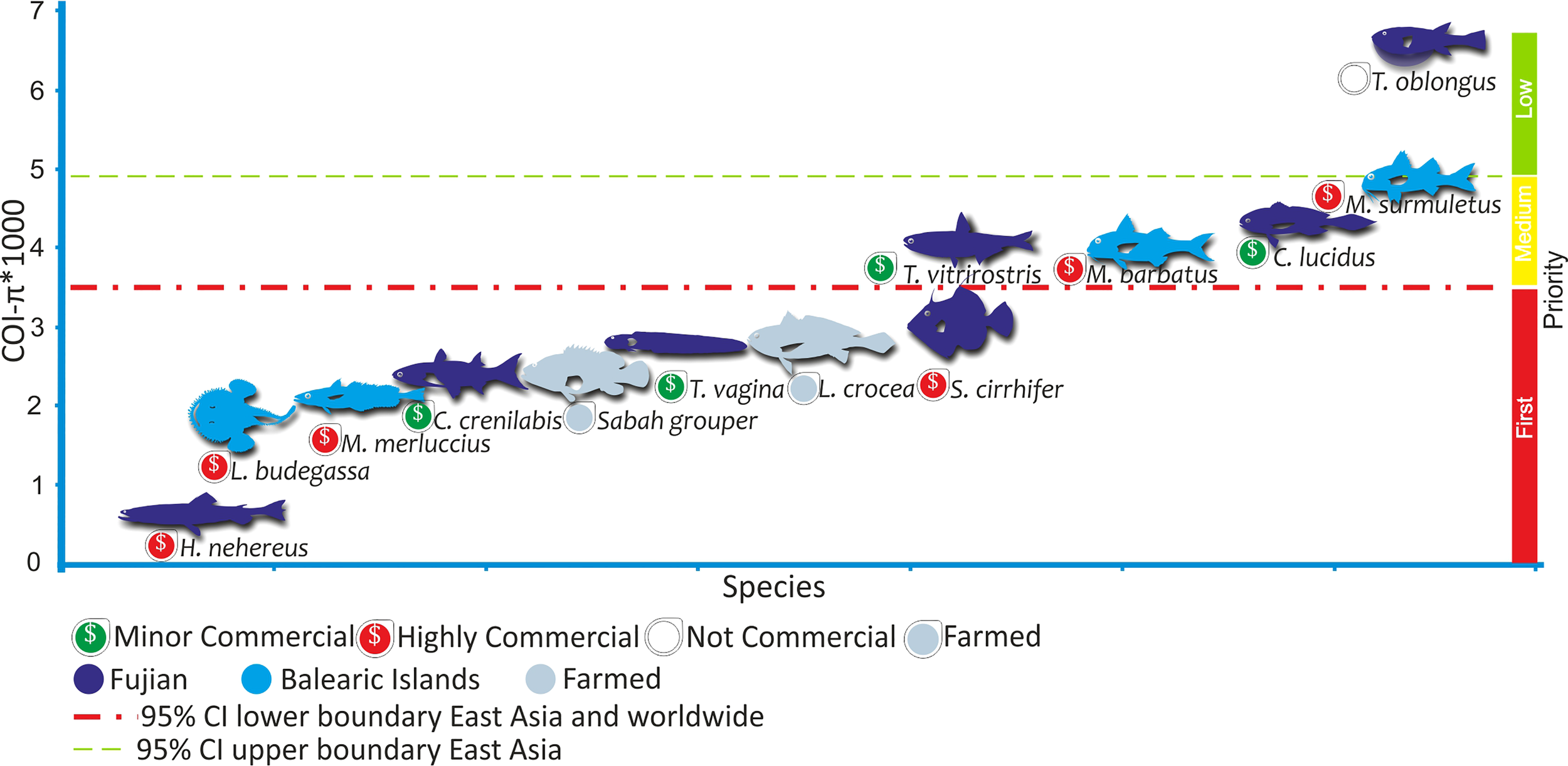 We contrasted the levels of COI-π of these four First Priority species to those of two farmed species, L. crocea and the hybrid Sabah grouper, finding that the levels of COI-π in the farmed are lower than 95% CI low boundary of East-Asian species and similar or even higher than the First Priority species (Figure 1 and Table 1).