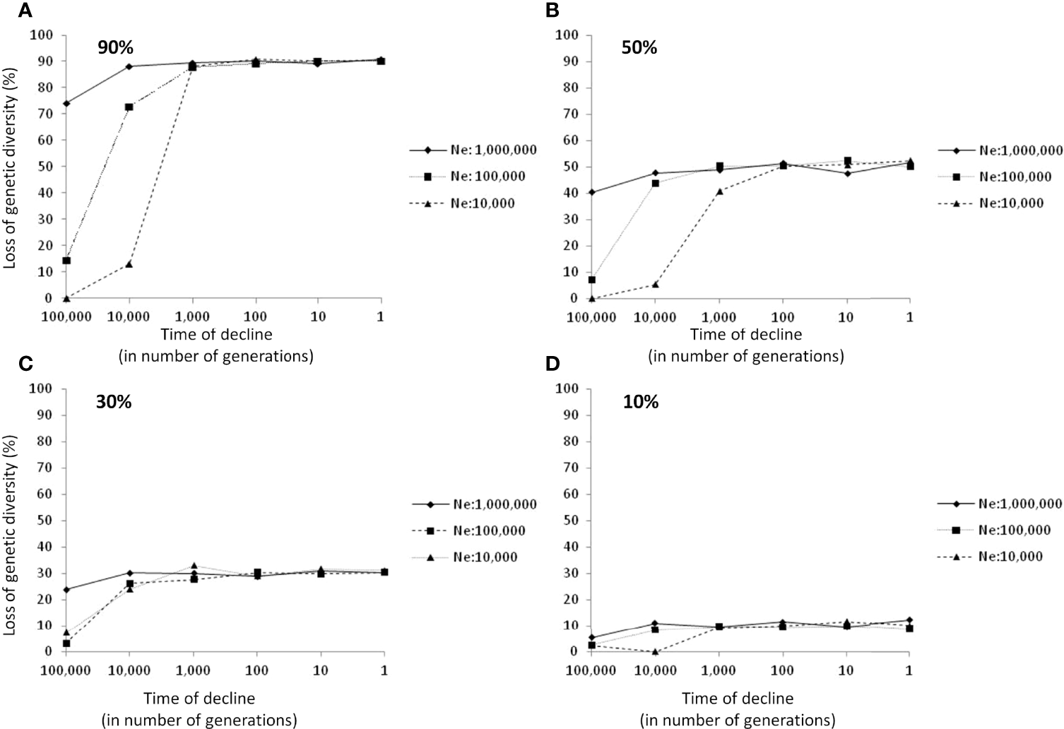 Average genetic diversity loss expected by declines in population census of 90% (A), 50% (B), 30% (C), and 10% (D) of its original size. Each mark represents the average loss of genetic diversity expected from 1000 random-generated samples that experienced a decline in population census at a different time (100,000; 10,000; 1,000; 100; 10; or 1 generations ago). Three different effective population sizes were simulated (Ne=10e6, 10e5 and 10e4) for each time of decline and each percentage of decline (N=72 simulations in total). The starting value of Ɵ was 2.5, which is an approximation to the median value of worldwide and East Asia fish datasets (Supplementary Table S2).