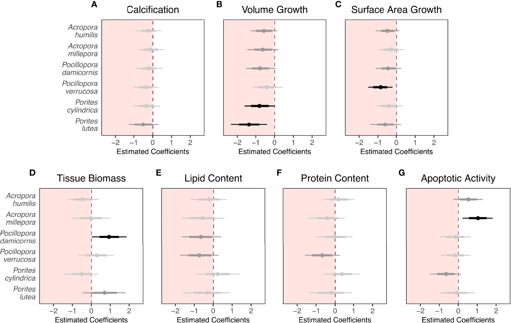 Effect of three-month low pH treatment on (A) calcification, (B) volume growth, (C) surface area growth, (D) tissue biomass, (E) lipid content, (F) protein content, and (G) apoptotic activity of six scleractinian coral species (n = 9 fragments per species per treatment). Points indicate the median of modeled regression coefficients of comparisons between treatment groups within a Bayesian framework from a generalized linear latent variable model (GLLVM). Thin and thick lines are 95% and 75% credible intervals (CIs), respectively. Statistically significant effects (i.e., 95% CIs that do not overlap zero) are colored black, trends (i.e., 75% CIs that do not overlap zero) are colored dark grey, and non-significant effects are colored light grey. Summarized parameter coefficients and CIs extracted from the GLLVM are provided in Supplementary Table S5.