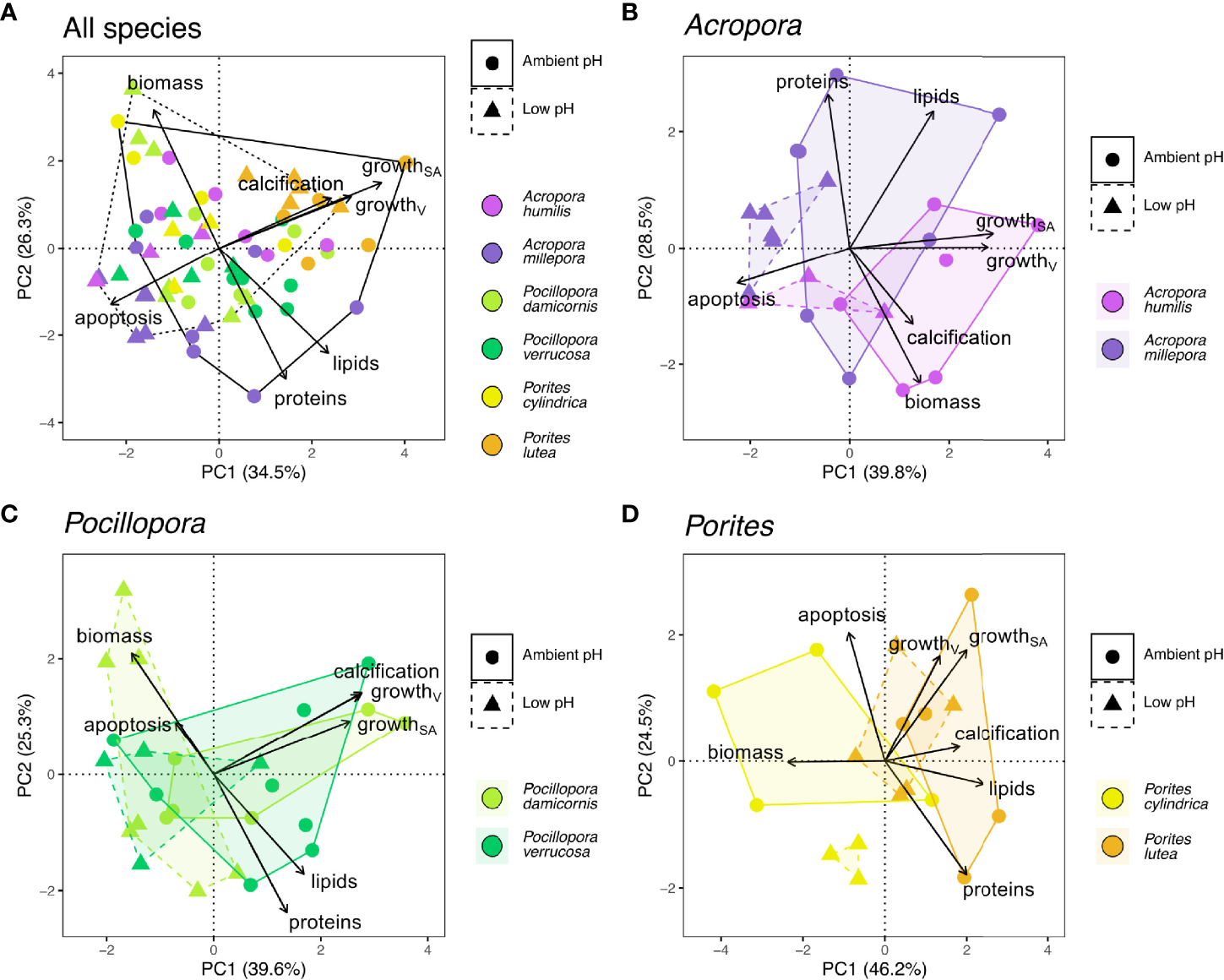 Principal component analyses (PCA) using seven physiological parameters (calcification; growthV, volume growth; growthSA, surface area growth; biomass, tissue biomass; lipids, lipid content; proteins, protein content; apoptosis, apoptotic activity) of six scleractinian coral species maintained in ambient and low pH treatments. PCAs were performed for (A) all coral species and for two species each in the genera (B)Acropora, (C)Pocillopora, and (D)Porites. Convex polygons outline ambient pH (solid line) and low pH (dashed line) treatments.
