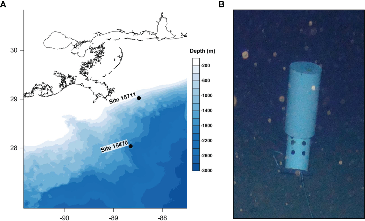 (A) Map depicting the location of historic wooden shipwreck sites in the northern Gulf of Mexico. (B) Image of submerged MRE on the seafloor with the cover floating and coupons exposed.