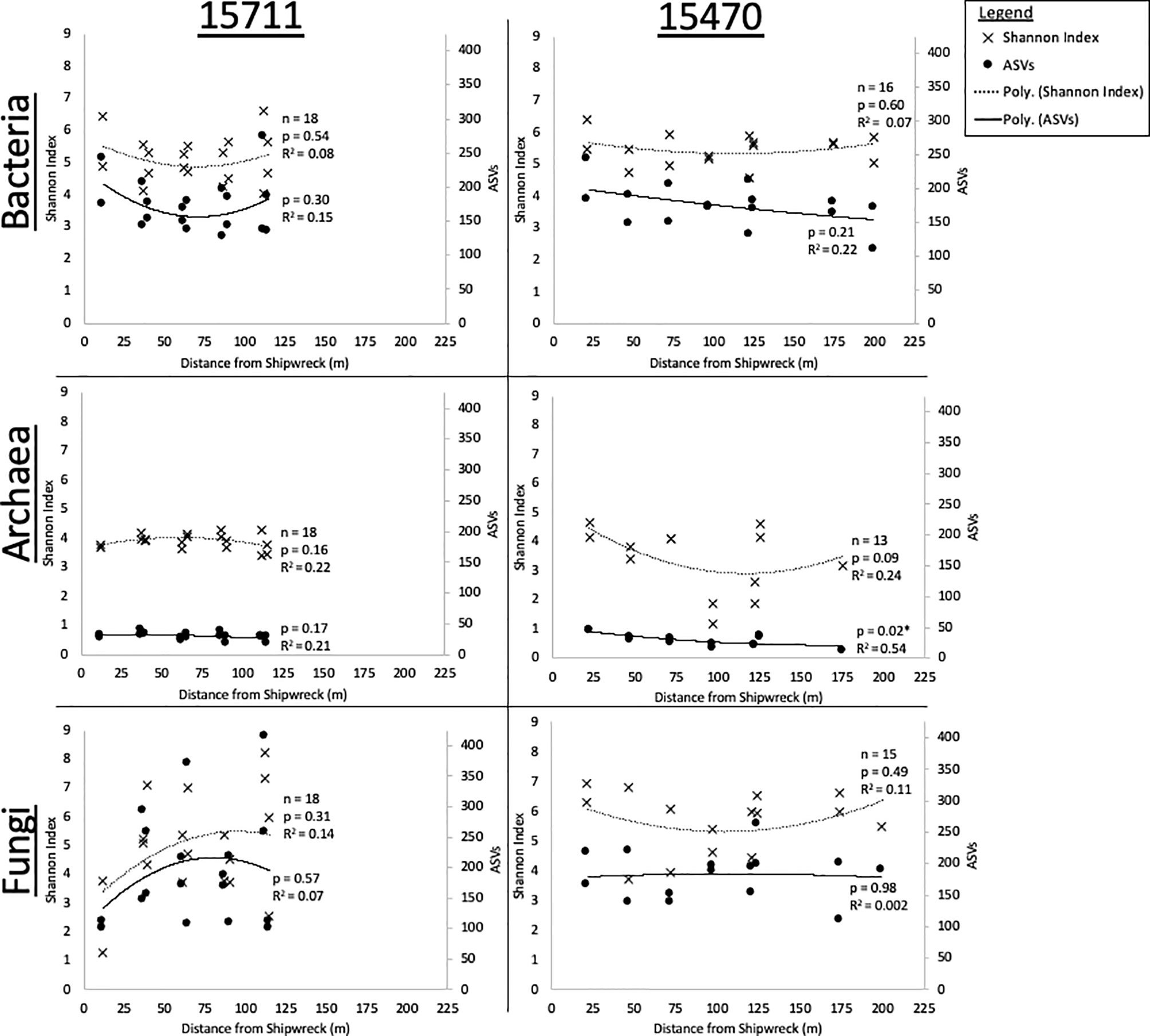 Shannon Diversity and ASV Richness plotted as a function of distance for each site and each domain with replicates averaged. Significance (p < 0.05) of polynomial regression indicated by *.