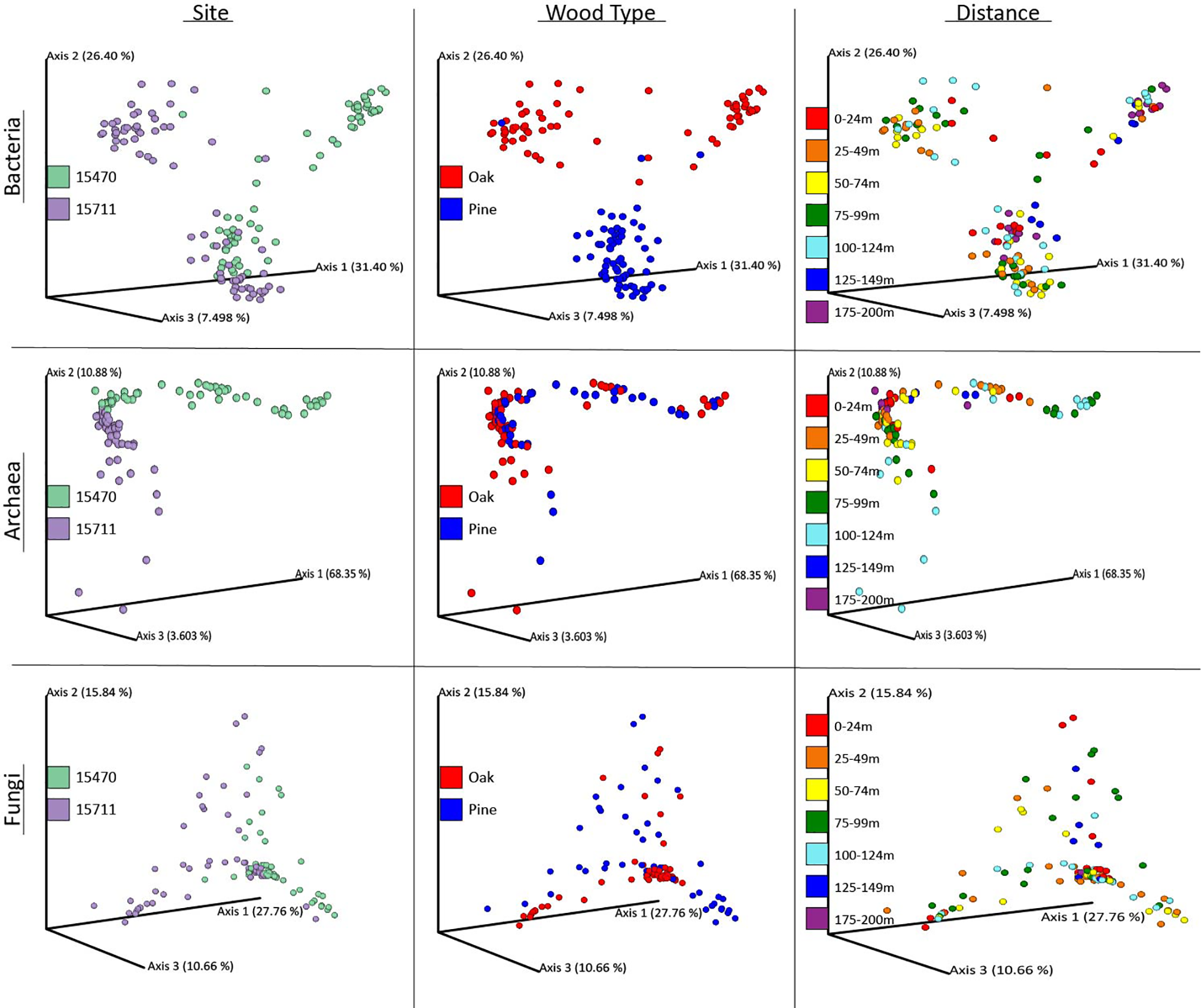 Weighted UniFrac results displayed as PCoA for Site, Wood Type, and Distance for all three domains. Samples were grouped in distance categories spanning 25 m for visualization.