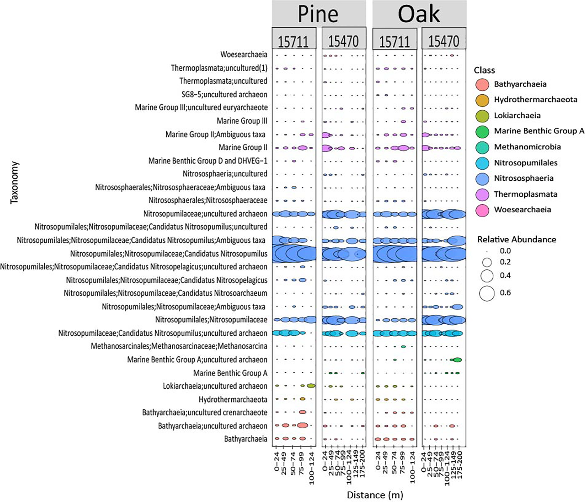 Bubble plot representing the 30 most abundant archaeal taxa from both sites and wood types. Samples are grouped in distance categories spanning 25 m.