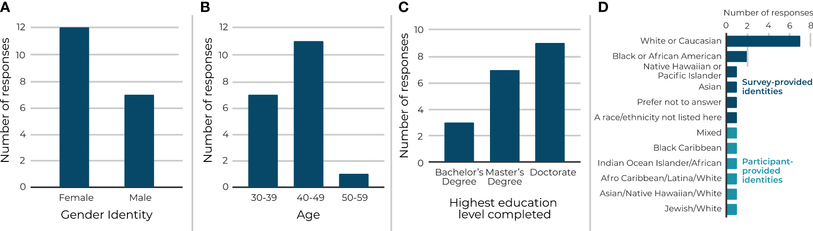 The twenty interview participants were marine professionals representing a broad cross-section of domain expertise such as education, diving, traditional navigation, science, engineering, indigenous knowledge, and conservation. Interviewees were located in ten countries and conducted fieldwork in every ocean basin (Figure 2). One-third of the interviewees live in countries or territories with developing economies3, including 21% who live in SIDS. Of the nineteen interviewees who self-reported their demographic backgrounds, 63% are female, and 37% are male (Figure 3A). At the time of the interviews, 37% were between the ages of 30-39 years old, 58% were 40-49, and 5% were 50-59 (Figure 3B); and 16% had completed a bachelor’s degree, while 37% had a master’s degree, and 47% had a doctoral degree (Figure 3C). In terms of ethnic/racial origin, seven (37%) of the nineteen interviewees identified as White or Caucasian, two (11%) as Black/African-American, and one each as Native Hawaiian/Pacific Islander, Asian, Afro Caribbean/Latina/White, Asian/Native Hawaiian/White, Black Caribbean, Indian Ocean Islander/African, Mixed, and Jewish/White. One each selected ‘A race/ethnicity not listed here’ and ‘Prefer not to answer’ (Figure 3D).