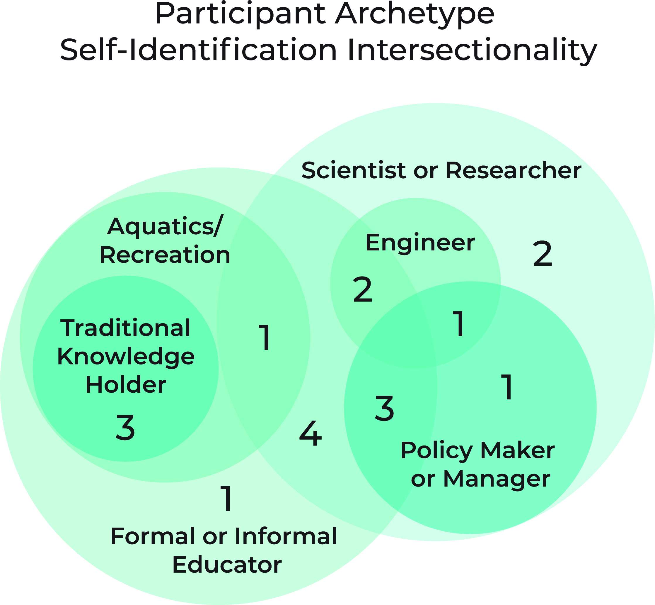 Eighteen out of twenty interviewees self-identified up to three archetypes they consider to represent themselves (Figure 4). The most frequently represented archetypes were Scientist/Researcher and Formal or Informal Educator (78% each). These were followed by: Policy Maker or Manager (28%), person in Aquatics/Recreation (22%), Engineer (17%), and Traditional Knowledge Holder (17%). Individuals identified as different combinations of these archetypes (Figure 4), resulting in specific motivations and requirements that guided ideation and decision-making processes (Table 1).