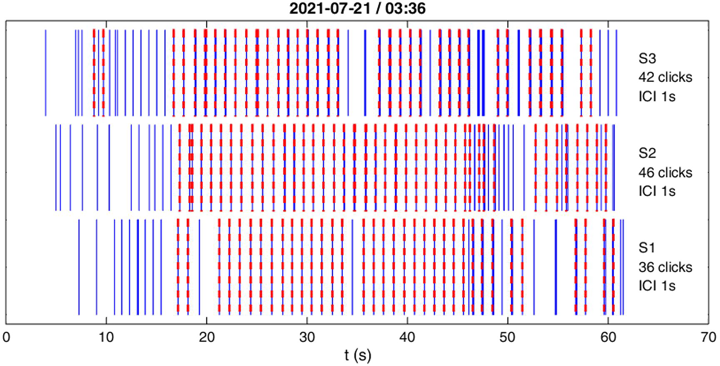 A “detection event” is confirmed either i) when there are at least two detection flags raised in the current 1-minute recording (detection at two different hydrophones) or ii) when there is one detection flag raised in the current 1-minute recording and at least one more detection flag raised in any of the previous two 1-minute recordings. The above scheme was decided in an effort to increase the statistical significance of the detections and reduce the probability of false alarms, taking into account that sperm whale clicks can sometimes be confused with ship noise. Further, due to the large separation between the hydrophones and the directionality of sperm whale clicks, the latter may be received and detected at only one hydrophone, which may be different in subsequent 1-minute recordings. Figure 2 presents a typical case of sperm-whale detection at the three hydrophones in a 1-minute recording.