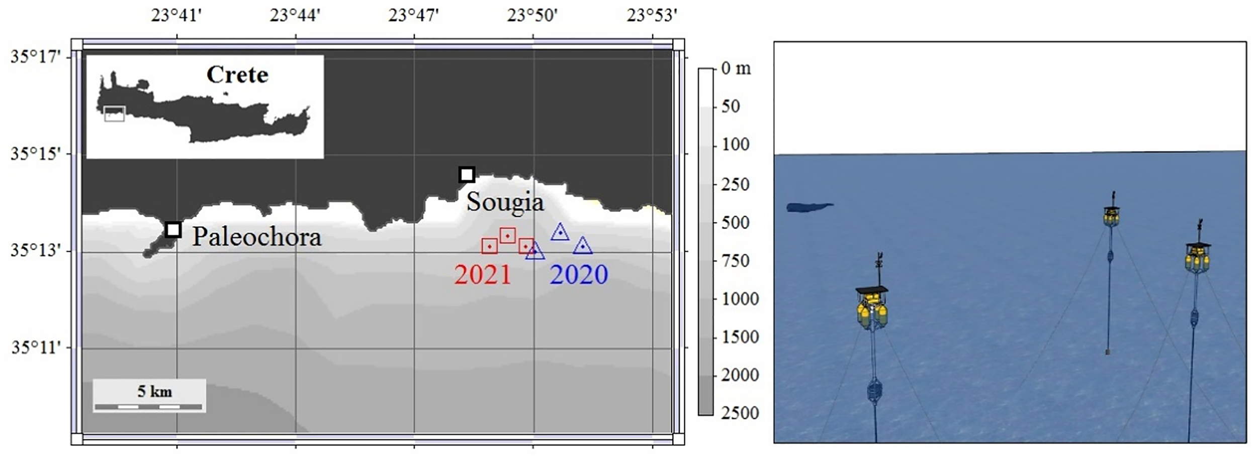 Left: Buoy locations of the SAvEWhales observatory in the 2020 and 2021 deployment in the Sougia Bay off SW Crete. Right: A schematic view of the anchored acoustic stations.