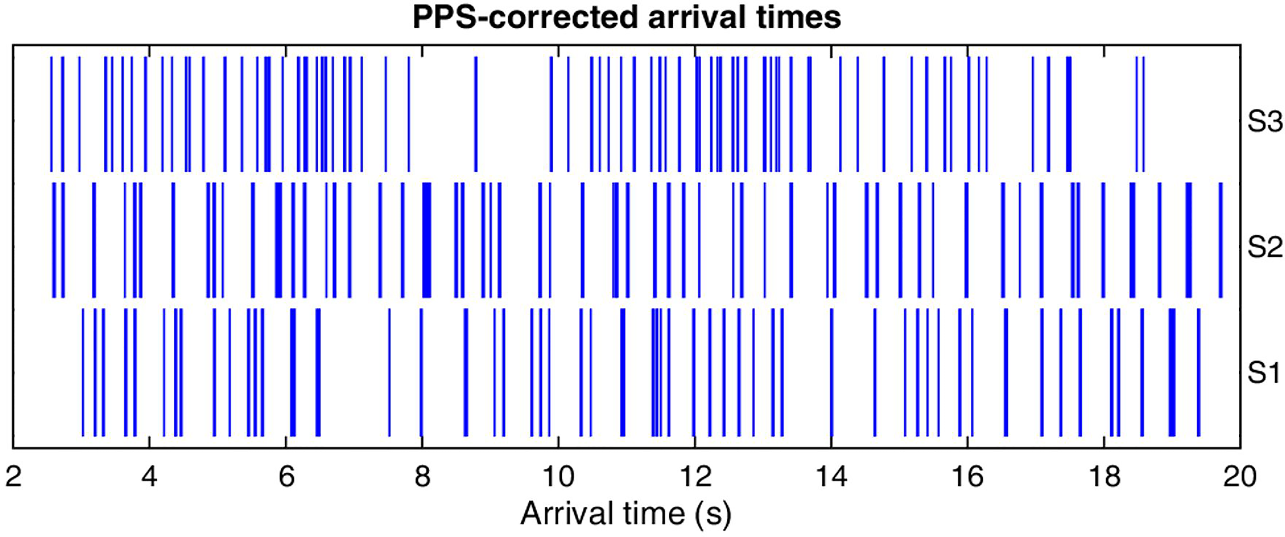 (a) PPS Correction: The received synchronization data, i.e. the arrival times of the PPS pulses at each acoustic station, are processed to estimate the relative delays for the three hydrophone pairs (SWAN1-SWAN2, SWAN1-SWAN3, SWAN2-SWAN3). These delays are then used to bring the corresponding three sequences of acoustic arrival times to a common time reference. Prior to the PPS correction the acoustic time series are synchronized within a few milliseconds. After the PPS correction a synchronization accuracy of the order of 1 microsecond is achieved.