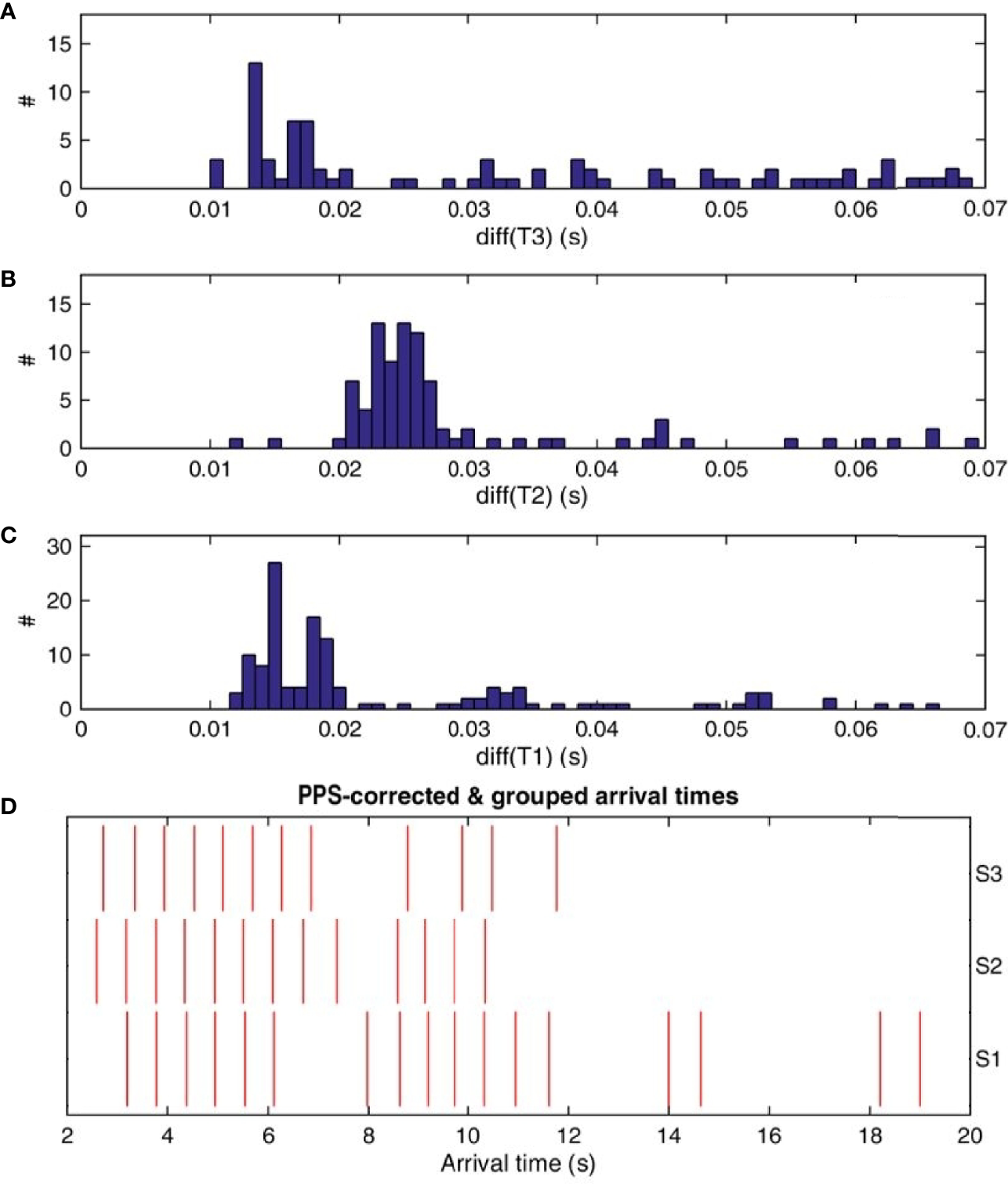 The cross-correlation histograms between the arrival times for the three hydrophone combinations, T3-T2, T3-T1 and T2-T1 are shown in the upper three panels of Figure 9. The offsets corresponding to the histogram peaks are compatible with each other – they sum up to zero – and they are also compatible with the geometry, i.e. there exist source locations resulting in comparable offsets. By applying the opposites of the T3-T1 and T2-T1 offsets to the arrival patterns at SWAN3 and SWAN2, respectively, the peaks in the shifted arrival patterns become aligned with those in the arrival pattern at SWAN1, which allows for direct arrival matches. This can be seen in the bottom panel of Figure 9 presenting 14 peak associations, marked by the black dashed lines, of which 8 between all three hydrophones, 3 between SWAN1 and SWAN2, 2 between SWAN1 and SWAN3, and finally 1 between SWAN2 and SWAN3. Using these associations, the TDOAs required for the 3D localization can be estimated.