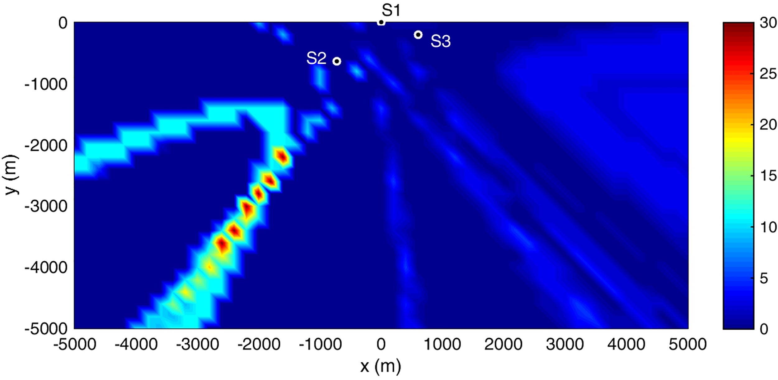 Initial search for source location in the horizontal based on associations between paired arrivals at the different hydrophones, those shown in Figure 7D. The three black dots indicate the mooring locations and the color represents the association count as a function of source location.