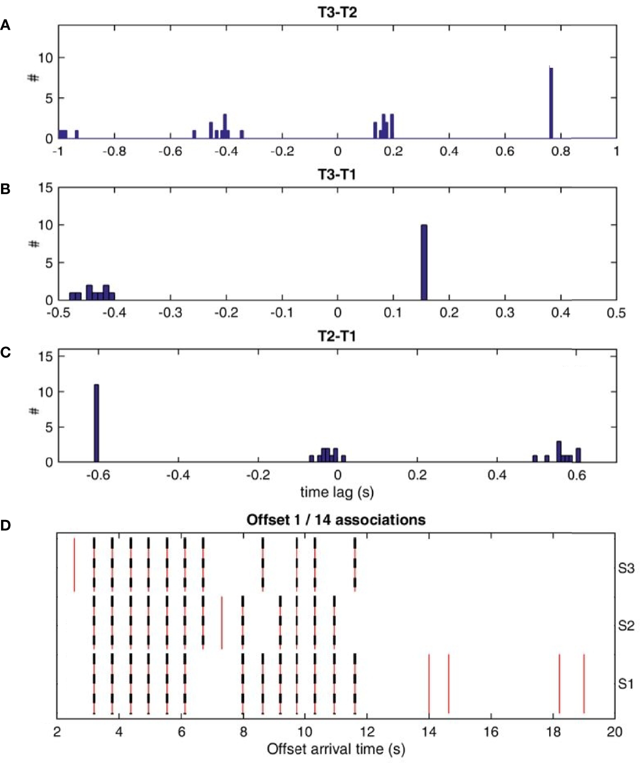 Cross-correlation histograms between the arrival patterns of Figure 7D for the three different hydrophone combinations: (A) SWAN3-SWAN2, (B) SWAN3-SWAN1 and (C) SWAN2-SWAN1; the vertical axes (#) in panels (A–C) measure histogram counts.. (D) Aligned arrival patterns (red) using the opposites of the offsets in panels (B, C). Arrival associations (14 in total) are marked by the black dashed lines; 8 of them correspond to arrival associations among all three hydrophones (enabling 3H localizations) while the rest 6 correspond to arrival associations between various pairs of hydrophones (enabling 2H localizations).