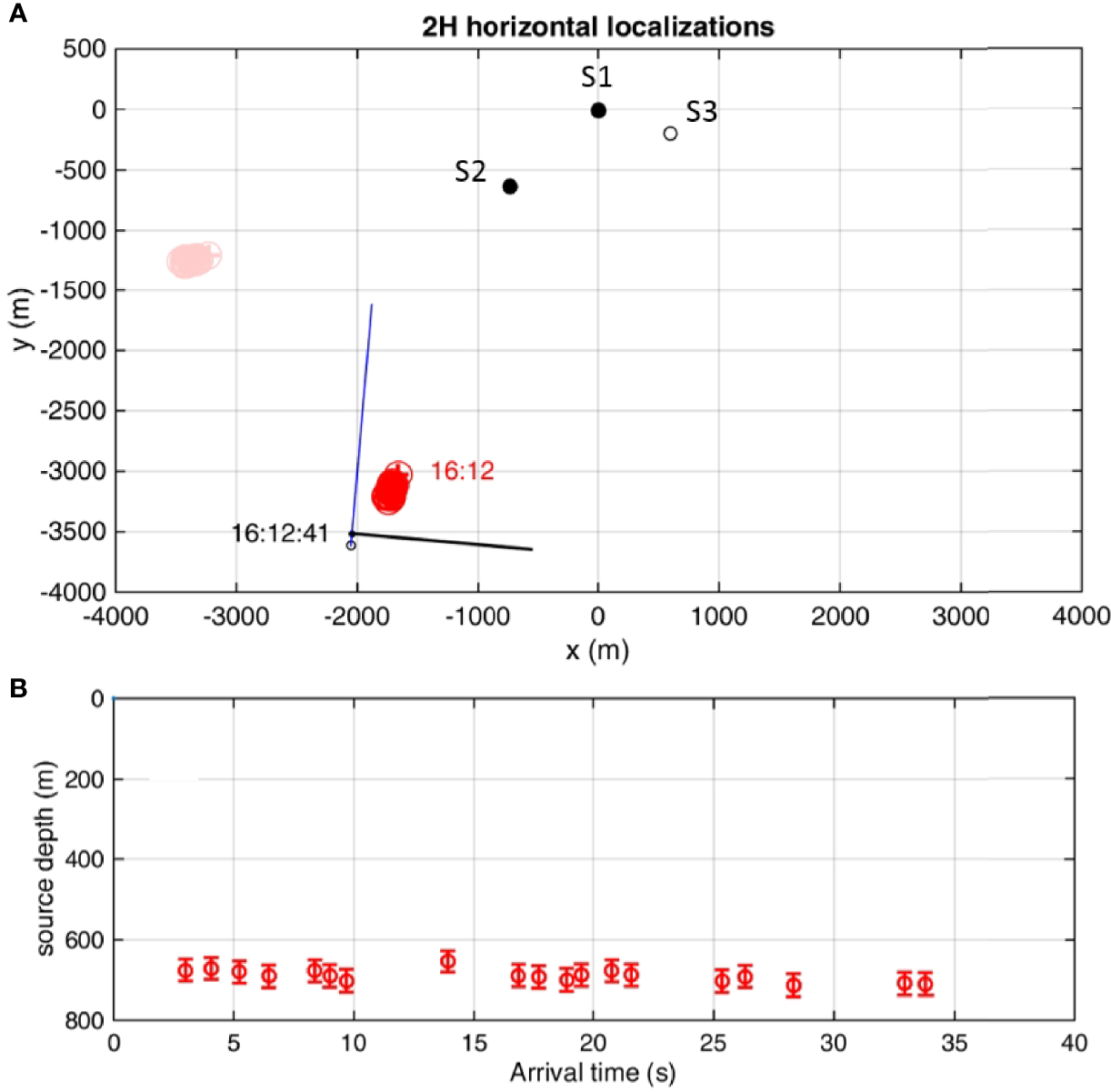 The nearest localization in this case is from the recording starting at 16:12 and it is based on 2 hydrophones, SWAN1 and SWAN2. The results are presented (in red) in Figure 11 where the top panel shows the localization in the horizontal and the course and location of the vessel at 16:12:41 (blue line and black circle respectively). The black line perpendicular to the course 100 m behind the vessel indicates the broadside direction. The localizations (in red) are consistent with each other. They lag the broadside line by about 250m and have a distance from the vessel course of about 250 m, much smaller than that in case “A”. On the other hand, the symmetric solutions, shown in light red, are more than 2 km away. The depth estimates are all at about the same depth, 700 m, with comparable and consistent uncertainties, about 30 m RMS, as shown in the lower panel of Figure 11.