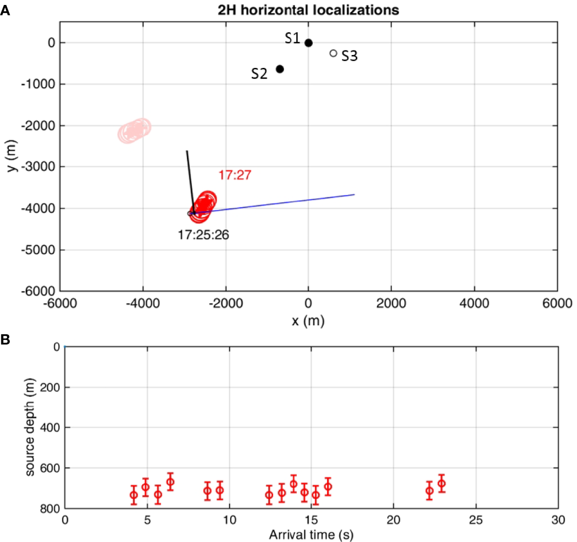 The localization in this case is based again on 2 hydrophones, SWAN1 and SWAN2. The top panel of Figure 12 shows the localization results in the horizontal (in red) from the receptions at 17:27 which is closest to the observation time. It also shows the course and location of the vessel at 17:25:26 (blue line and black circle respectively) and the broadside direction marked by the black line perpendicular to the course 100 m behind the vessel. The localizations are in good agreement with the independent observations, whereas the symmetric solutions, shown in light red, are again more than 2 km away. The source here is in about the same azimuthal direction with respect to the acoustic stations as in case “B” but at larger distance (4.7 km from SWAN1) – note the different scales. Because of this the localization uncertainties are higher. The localization results in the vertical are shown in the lower panel of Figure 12 with estimated source depths about 700 m and uncertainties of about 40 m RMS.