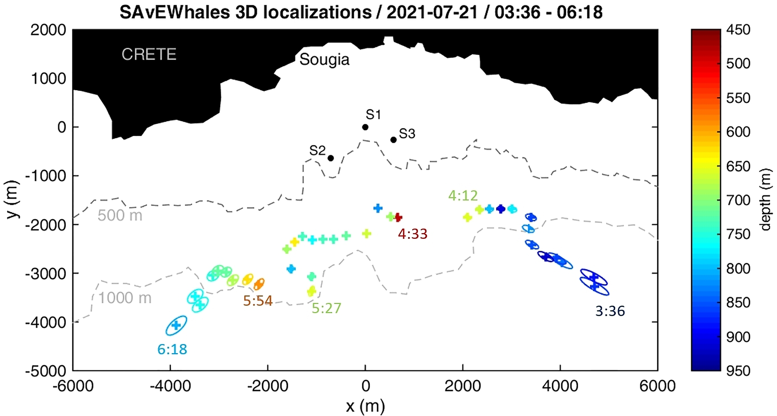 During the first verification campaign there where no encounters with sperm whales at all in the broader area of SW Crete. This is consistent with the fact that the very few detections registered by the SAvEWhales system during the 2020 deployment were outside the period of the verification campaign (Figure 4A). In contrast, in the 2021 deployment, there were several sperm-whale detections during the verification campaign, which also provided sufficient data (resolved direct and surface-reflected arrivals) for 3D localizations such that comparisons could be carried out. These comparisons are presented in section 4.1.