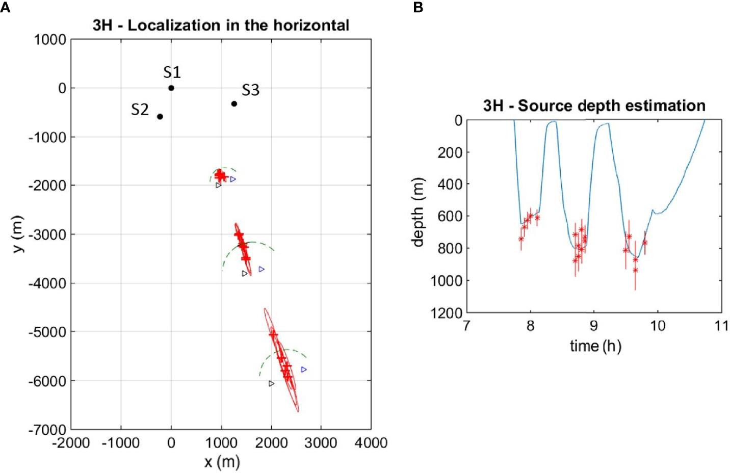 2H localization results in the horizontal from various combinations of two hydrophones are shown in red color in the middle panel of Figure 10, corresponding to the 6 associations between two hydrophones in Figure 9D. In order to interpret these localization results one has to recall that 3D localizations based on two hydrophones are characterized by large range and depth uncertainties for sources in the broadside direction, decreasing towards the endfire, and by large azimuth uncertainties for sources in the endfire direction, decreasing towards the broadside (Skarsoulis and Dosso, 2015). Two of the localizations in Figure 10B have large range and small azimuth uncertainties, whereas the other four have small range and larger azimuth uncertainties. The former correspond to the associated arrivals between SWAN1 and SWAN3 (2 associations in Figure 9D), which have the source close to their broadside in the horizontal plane. This results in large range and small azimuth uncertainties. The other four localizations correspond to associations between SWAN1 and SWAN2 (3 associations), and also between SWAN2 and SWAN3 (1 association) in Figure 9D. Both pairs (SWAN1-SWAN2 and SWAN2-SWAN3) have the source close to their endfire in the horizontal plane, and this results in small range uncertainties and larger azimuth uncertainties.
