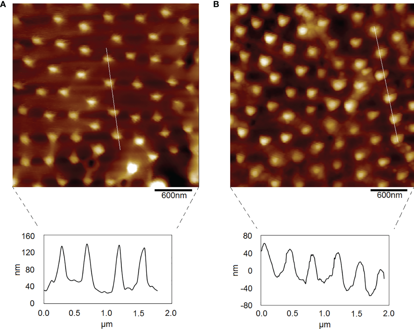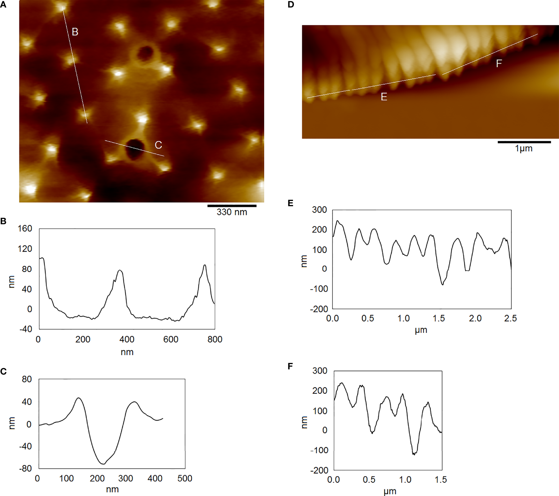 In this study, images of P. donghaiense cells from different angles and at different scales were obtained by atomic force microscopy (Figures 1A–F). Figure 1B shows the overall appearance from the left valve view. Figure 1C shows depression structure in the flagellum area at the top of the cell, and the flagellum of P. donghaiense cells can be observed in more detail in Figure 1D. Figure 1E shows the collar structure around the flagellum pores at the top of the cell. Figure 1F is the megacytic zone of the cell, and Figures 1G, H show the knob-like spines and valve pores on the shell surface of the cell. These morphological characteristics of the cell surface of P. donghaiense revealed in this study are similar to those obtained by Lu et al. through SEM (Lu et al., 2005), which indicates that AFM can be used to characterize the cell surface ultrastructure of P. donghaiense.